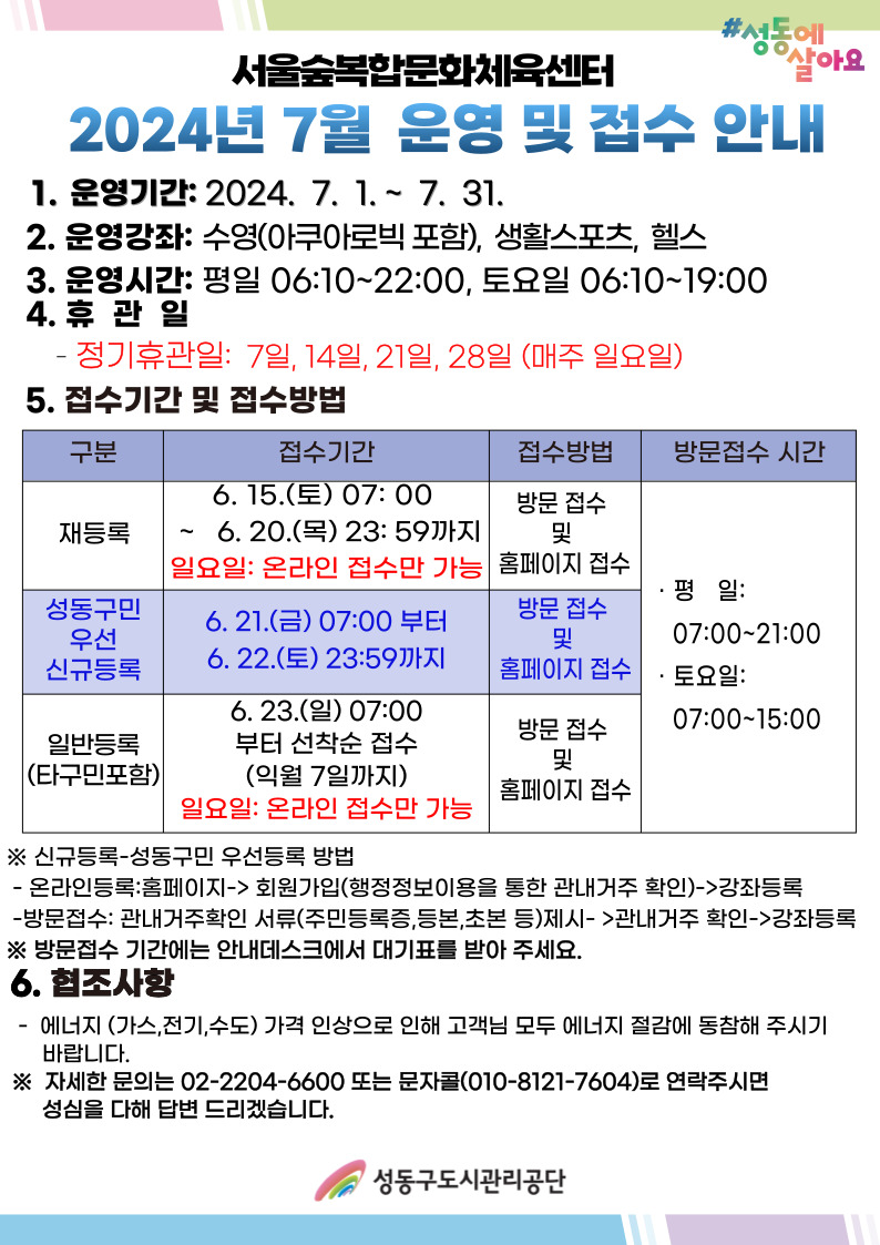 서울숲복합문화체육센터 7월 운영 및 접수 안내 작성자 관리자 등록일자 2024년 6월 20일 17시 15분 2초 조회 1,189 ○ 접수기간 - [재등록 고객] 6. 15.(토) 07:00 ~ 20.(목) 23:59 ※ 단, 일요일,공휴일은 온라인 접수만 가능 - [신규등록-성동구민 우선 등록 고객] 6. 21.(금) 07:00 ~ 22.(토) 23:59 - [신규등록-일반등록(타구민 포함)고객]6. 23.(일) 07:00 ~ 7. 7.(일) 23:59선착순접수 강좌-운영-및-접수-안내.jpg [ Size : 263.97KB , Down : 270 ] 미리보기 다운로드 목록보기