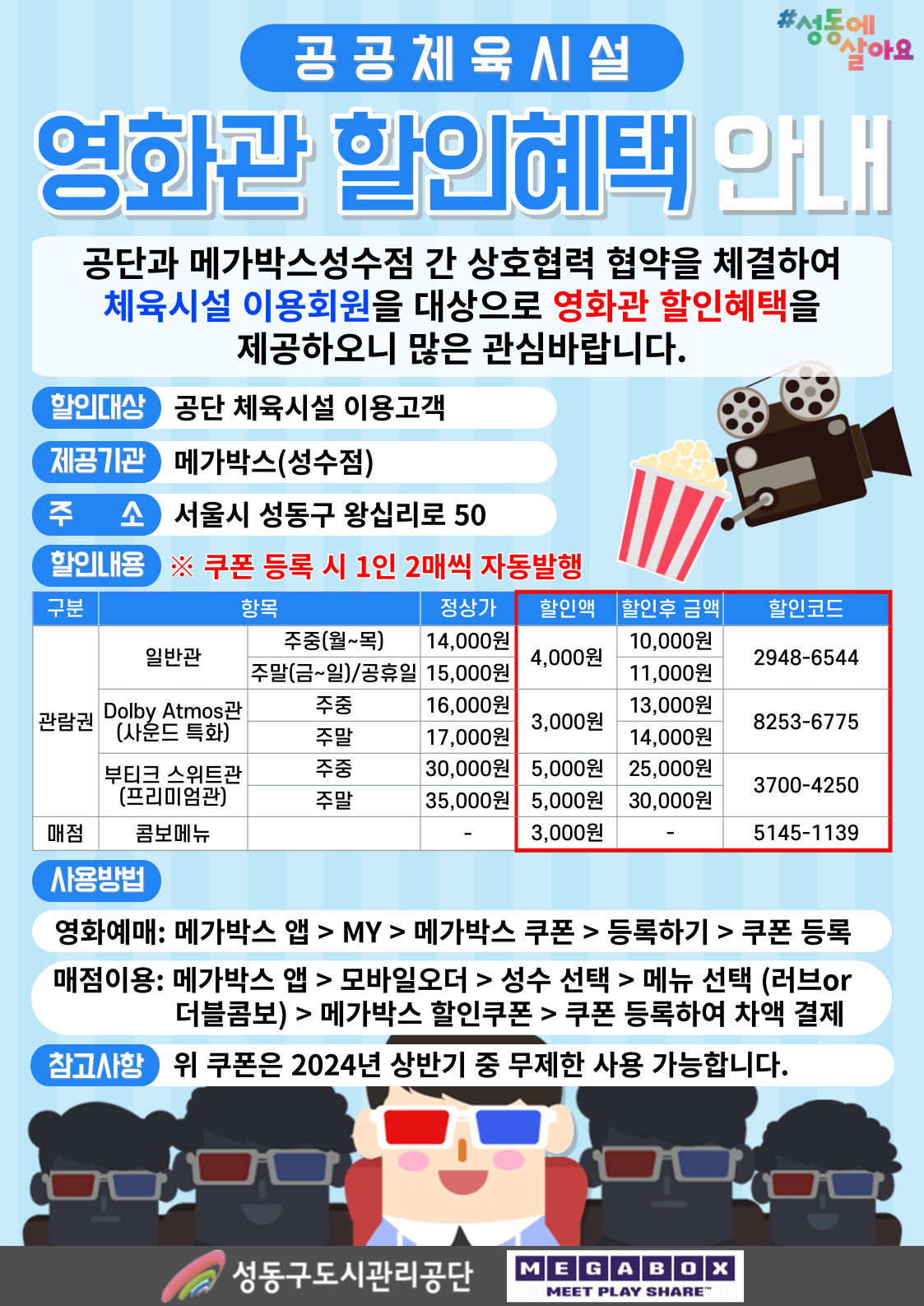 2024년 체육시설 이용 고객 영화관 할인 혜택 안내 작성자 관리자 등록일자 2024년 1월 23일 17시 38분 3초 조회 7,976 영화관 할인혜택 안내.jpg [ Size : 506.74KB , Down : 10,583 ] 미리보기 다운로드 목록보기
