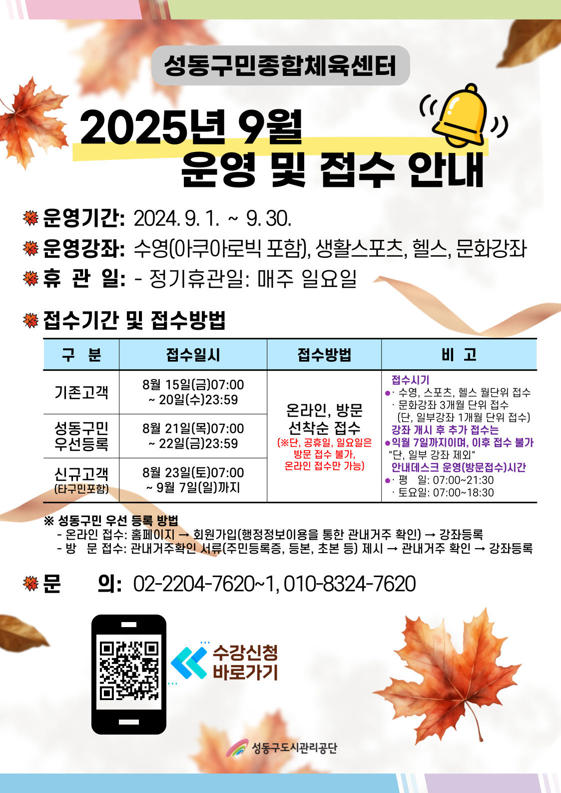 [성동구민종합체육센터] 9월 운영 및 접수 안내