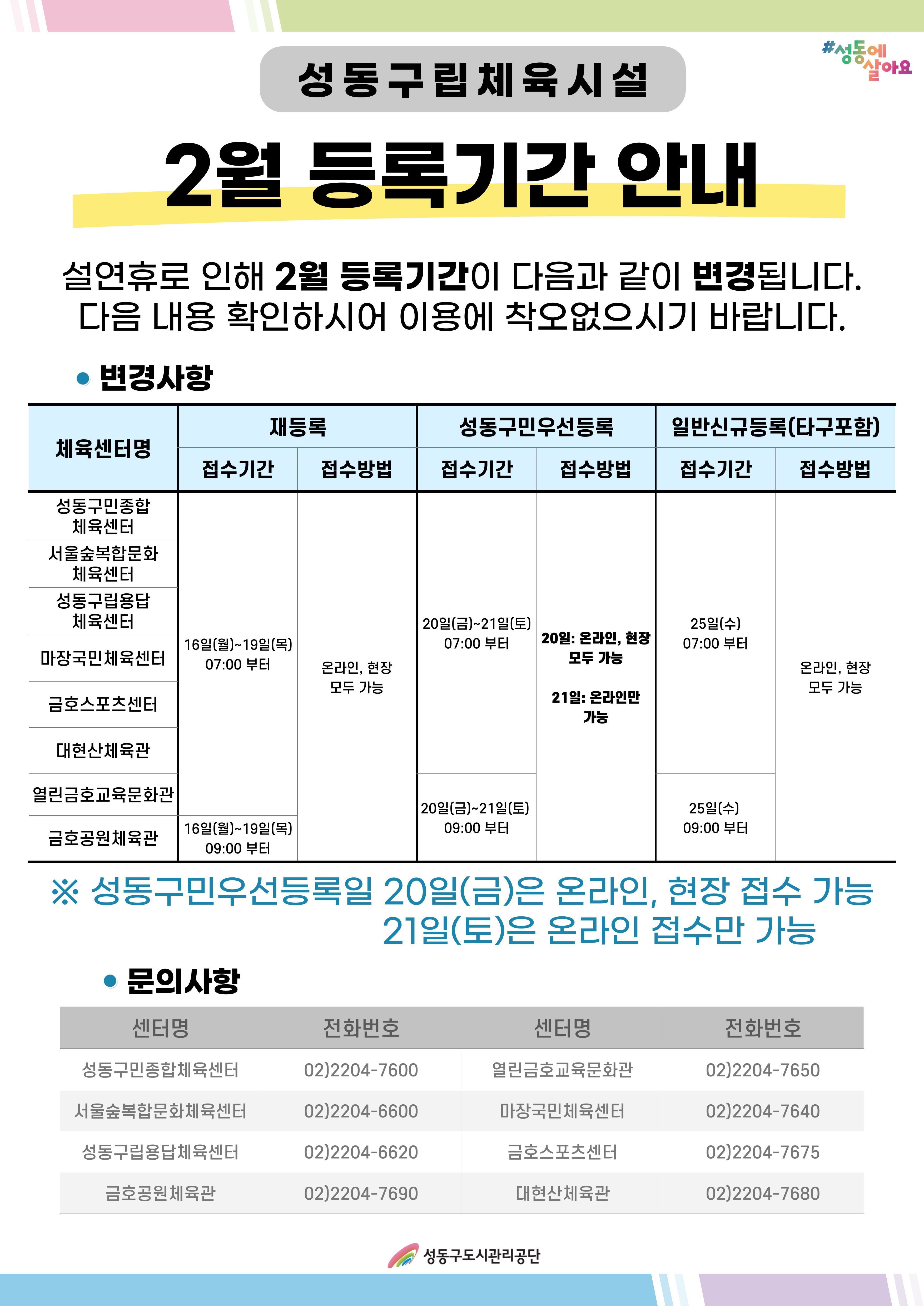 [성동구립체육시설] 2월 등록기간 안내문 작성자 관리자 등록일자 2023년 1월 4일 17시 21분 22초 조회 2,446 [성동구립체육시설] 2월 등록기간 안내문.jpg [ Size : 1.22MB , Down : 3,027 ] 미리보기 다운로드 목록보기