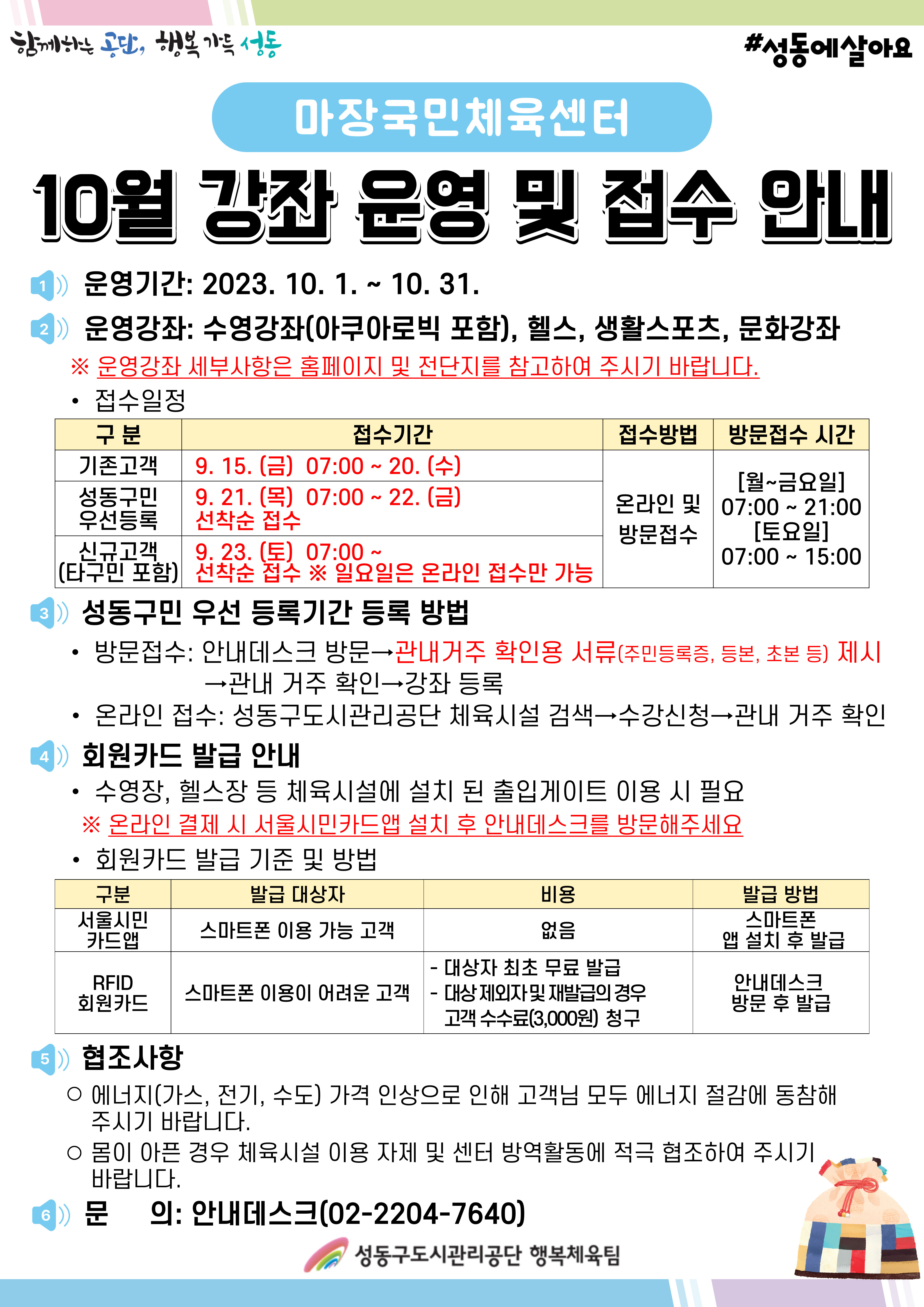 [마장국민체육센터] 2023년 10월 강좌 운영 및 접수 안내 작성자 관리자 등록일자 2023년 9월 11일 18시 8분 37초 조회 824 2023년 10월 강좌 운영 및 접수 안내(마장).jpg [ Size : 1.59MB , Down : 694 ] 미리보기 다운로드 목록보기