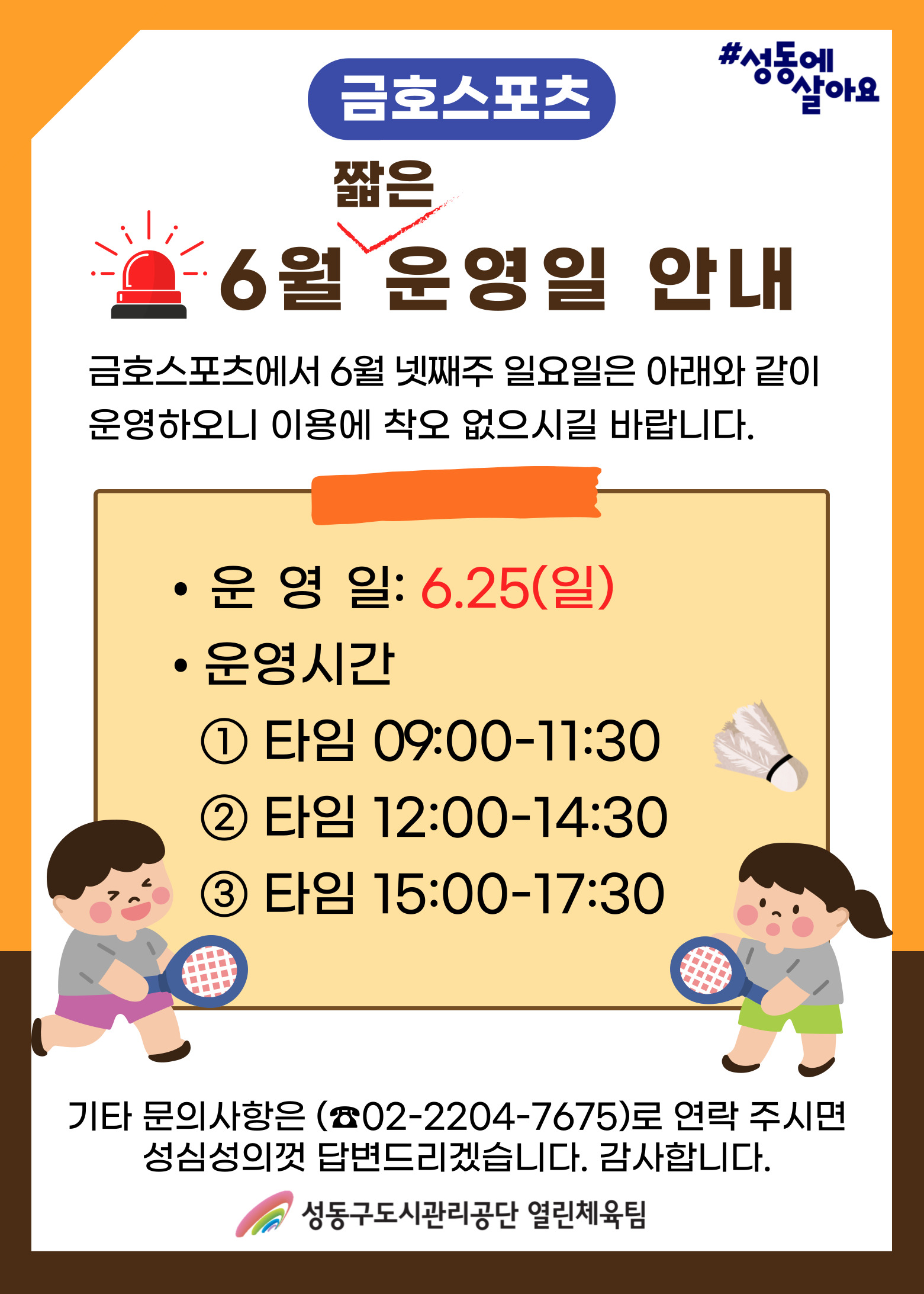 [금호스포츠] 6월 짧은 운영일 안내 작성자 관리자 등록일자 2023년 6월 16일 10시 56분 15초 조회 535 금호스포츠 6월 짧은 운영일 안내.jpg [ Size : 457.92KB , Down : 287 ] 미리보기 다운로드 목록보기