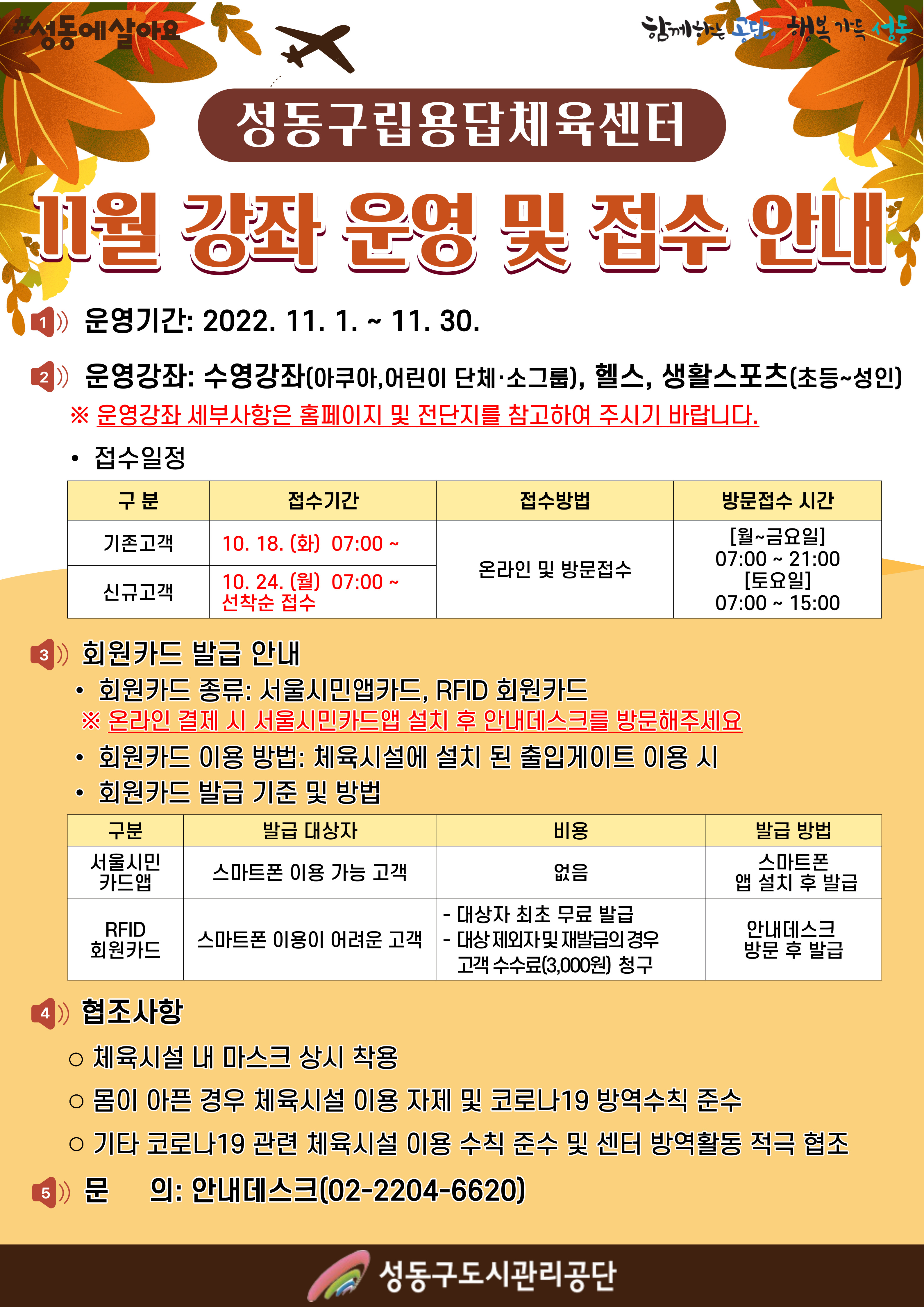 [용답체육센터] 11월 강좌 운영 및 접수 안내 작성자 관리자 등록일자 2022년 10월 14일 18시 7분 39초 조회 807 2022년 11월 강좌 운영 및 접수 안내(용답).jpg [ Size : 2.03MB , Down : 761 ] 미리보기 다운로드 목록보기