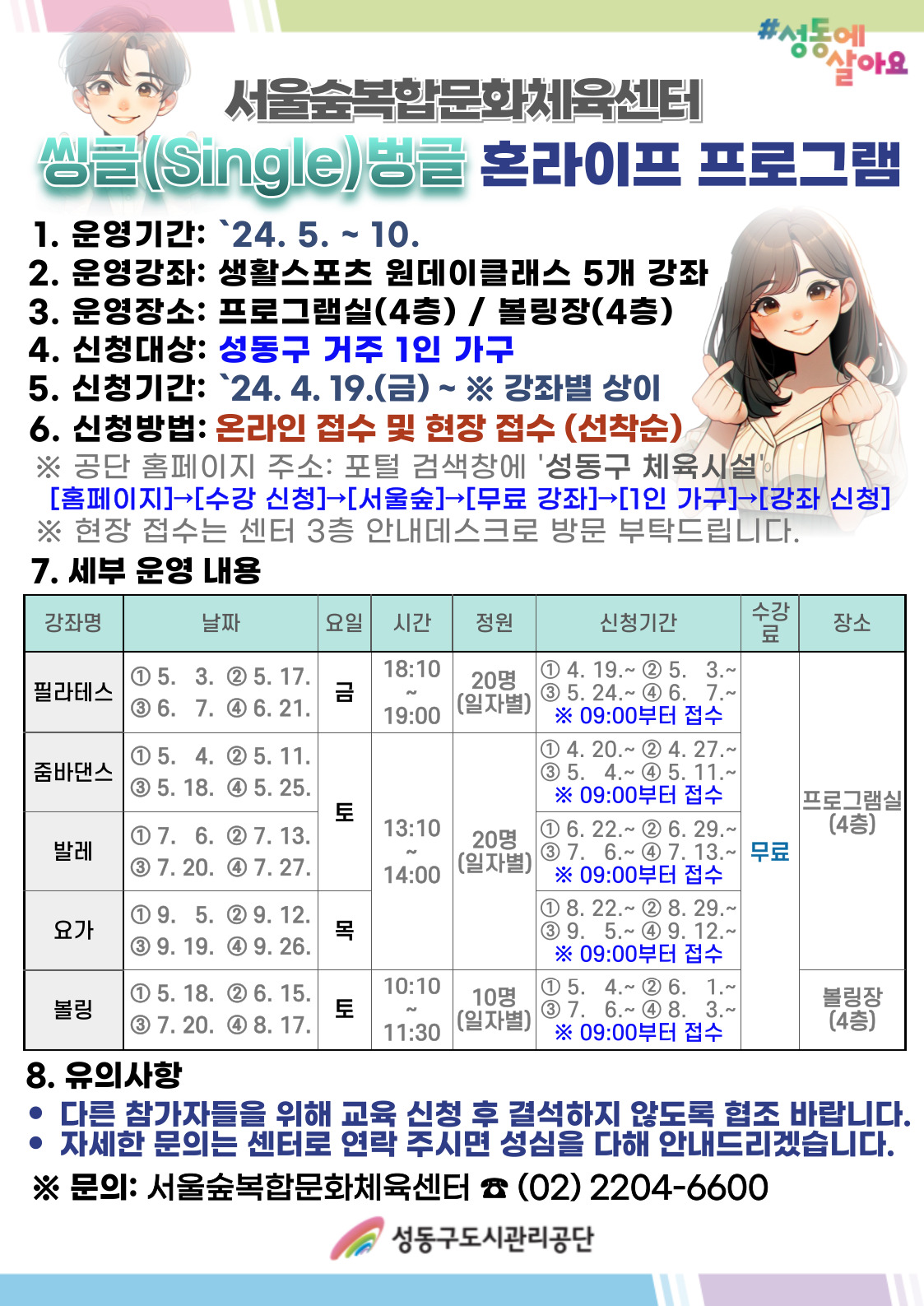 [서울숲복합문화체육센터 1인가구 '씽글(Single)벙글 혼라이프' 프로그램 운영 안내]