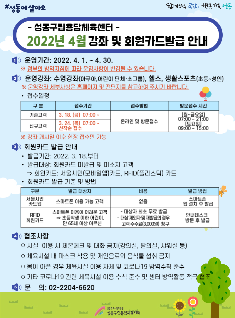 [성동구립용답체육센터] 4월 강좌 등록 및 회원카드 발급 안내 작성자 관리자 등록일자 2022년 3월 17일 13시 39분 49초 조회 1,187 2022년 4월 강좌 운영 및 접수 안내(용답).jpg [ Size : 540.92KB , Down : 849 ] 미리보기 다운로드 목록보기