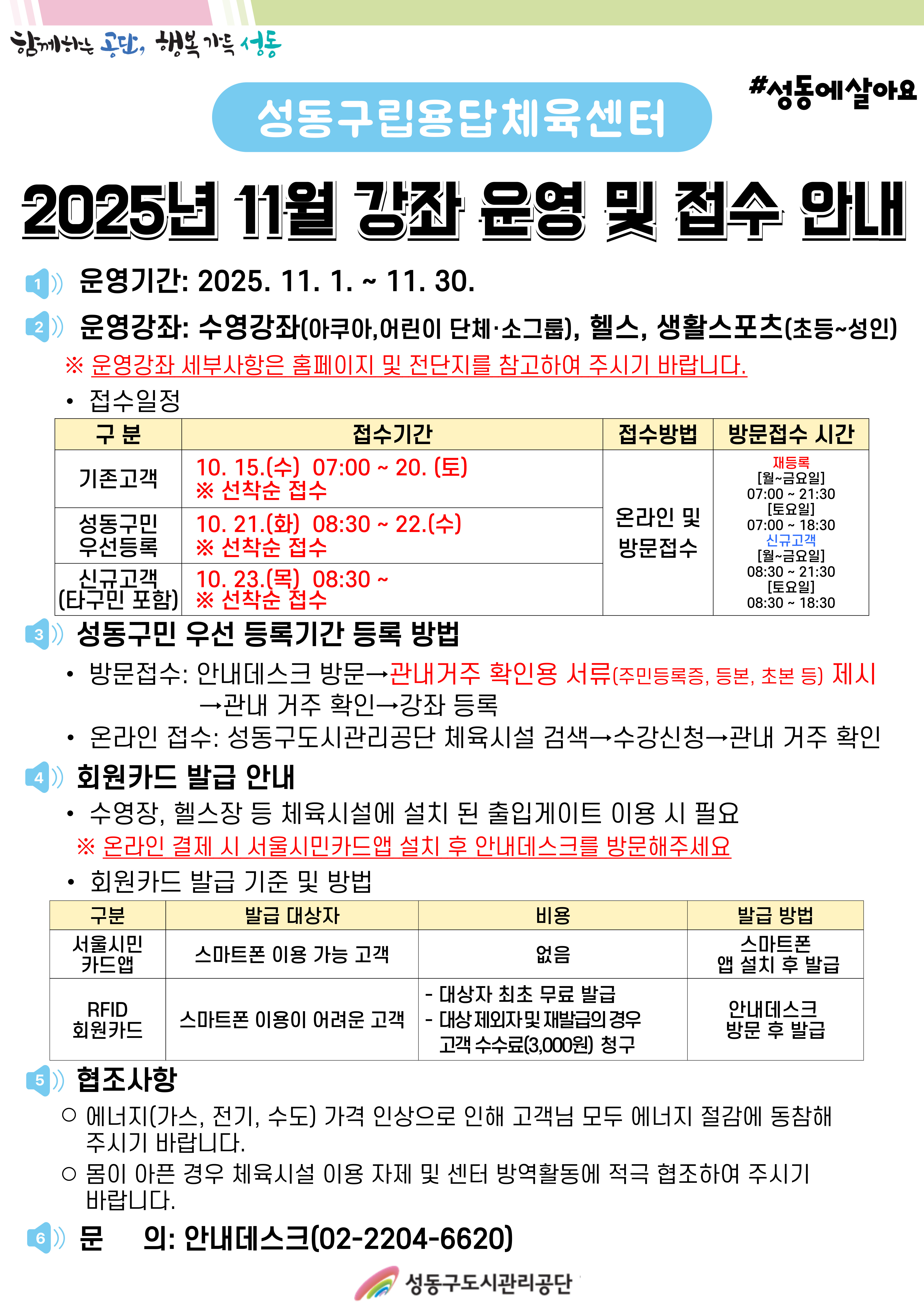 공지 [용답체육센터] 11월 강좌 접수 및 재등록 안내 작성자 관리자 등록일자 2025년 10월 14일 9시 30분 34초 조회 343 용답-재등록-11월.jpg [ Size : 2.65MB , Down : 44 ] 미리보기 다운로드 목록보기