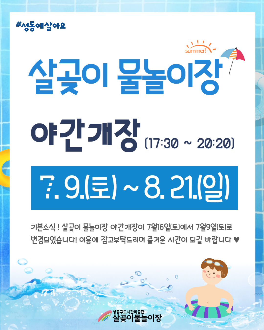 살곶이물놀이장 야간개장 안내 작성자 관리자 등록일자 2022년 7월 7일 16시 33분 9초 조회 2,356 살곶이물놀이장🏖️ 야간개장 안내기쁜소식! 살곶이물놀이장 야간개장이 7월16일(토)에서 7월9일(토)로 변경되었습니다.이용에 참고부탁드리며 즐거운 시간이 되길 바랍니다💘운영시간 주간: 10:00 ~ 16:50 (클린타임 12:50 ~ 14:00) 야간: 17:30 ~ 20:20 야간개장 일시 7. 9.(토) ~ 8. 21.(일) 살곶이물놀이장 야간개장 안내.png [ Size : 666.52KB , Down : 612 ] 미리보기 다운로드 목록보기