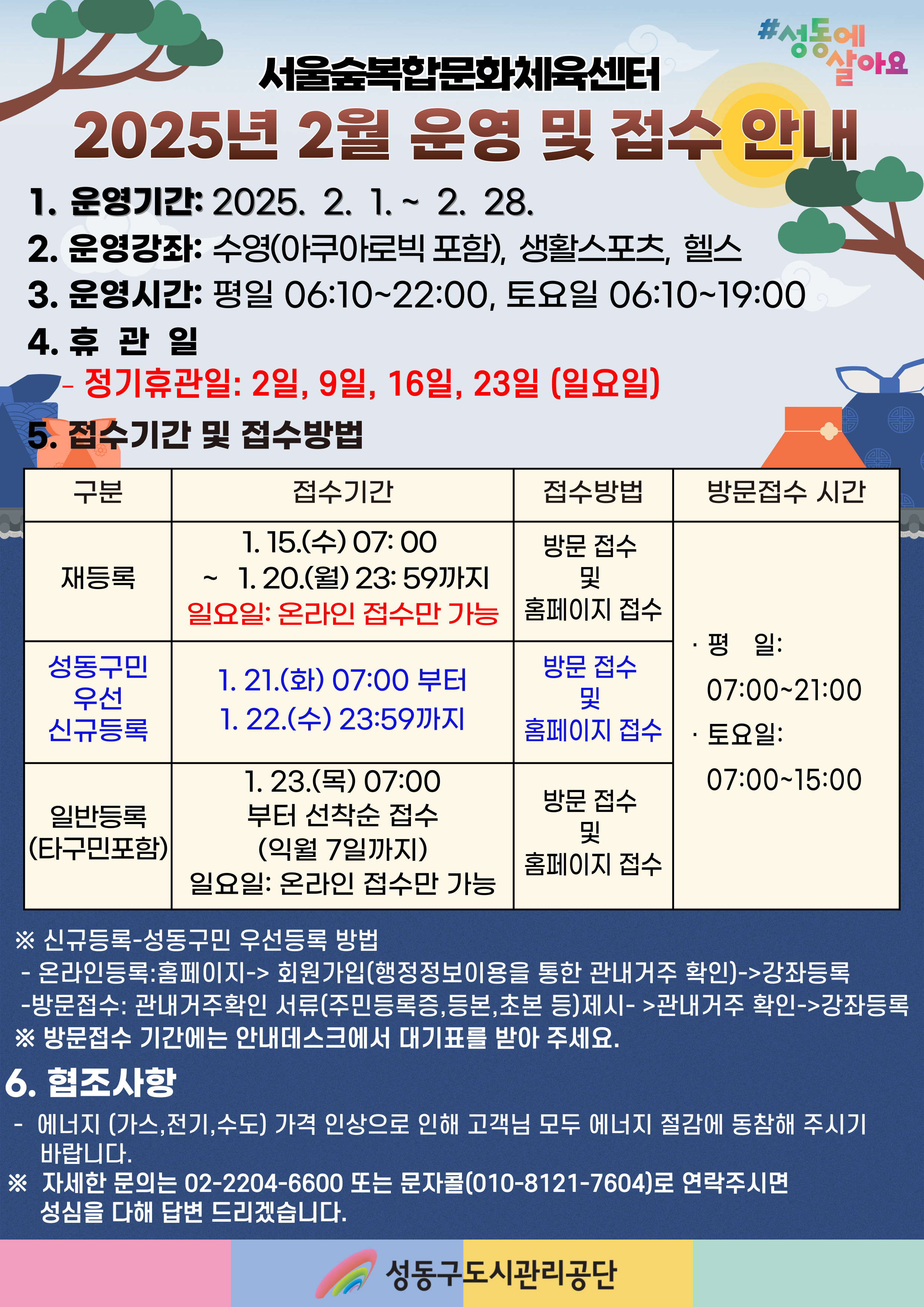 서울숲복합문화체육센터 2월 운영 및 접수 안내