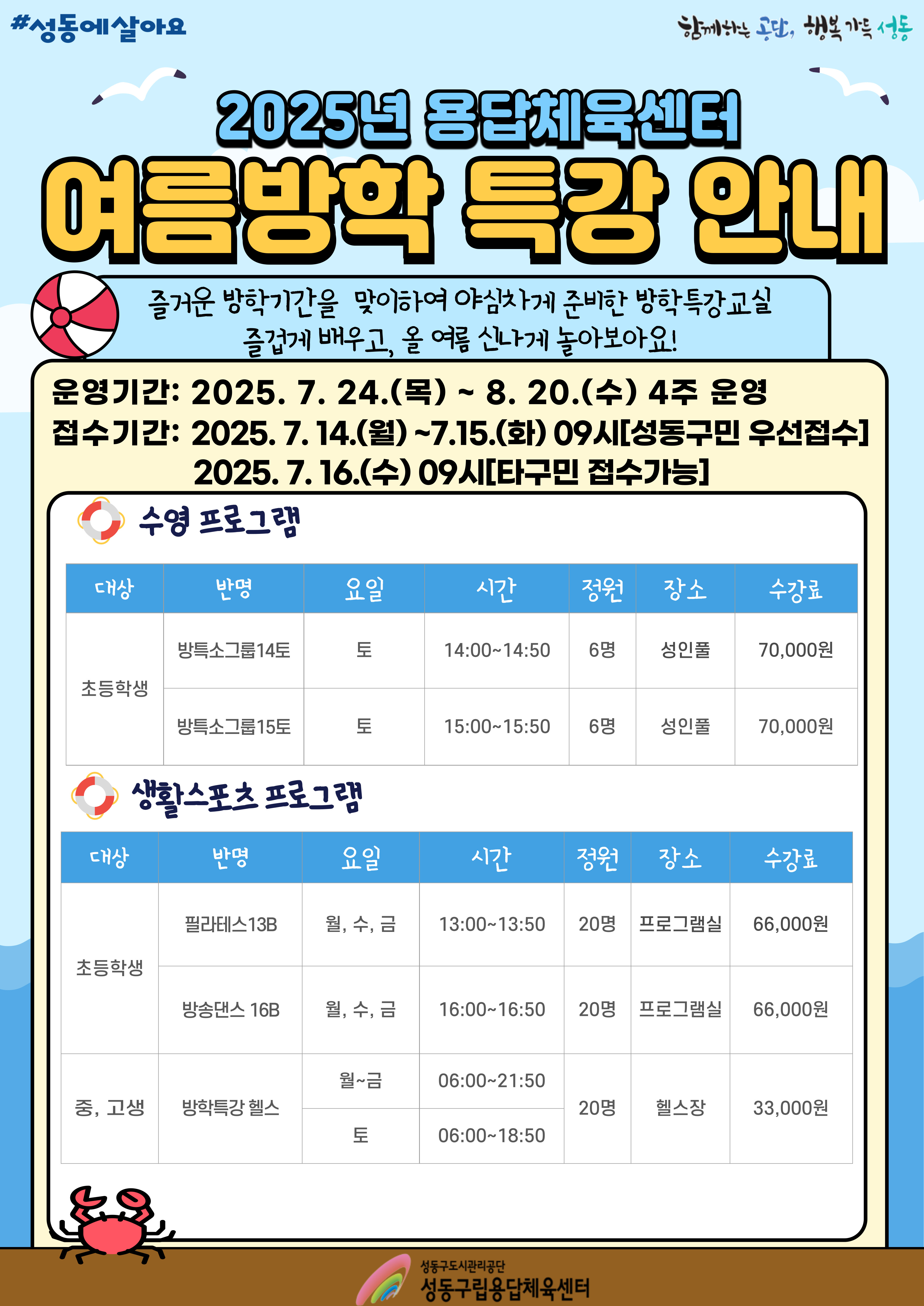 [용답체육센터]2025년 여름방학특강 운영안내 작성자 관리자 등록일자 2025년 6월 28일 10시 31분 8초 조회 773 사본 -2025년 여름방학특강 홍보물(0628).jpg [ Size : 1.61MB , Down : 797 ] 미리보기 다운로드 목록보기