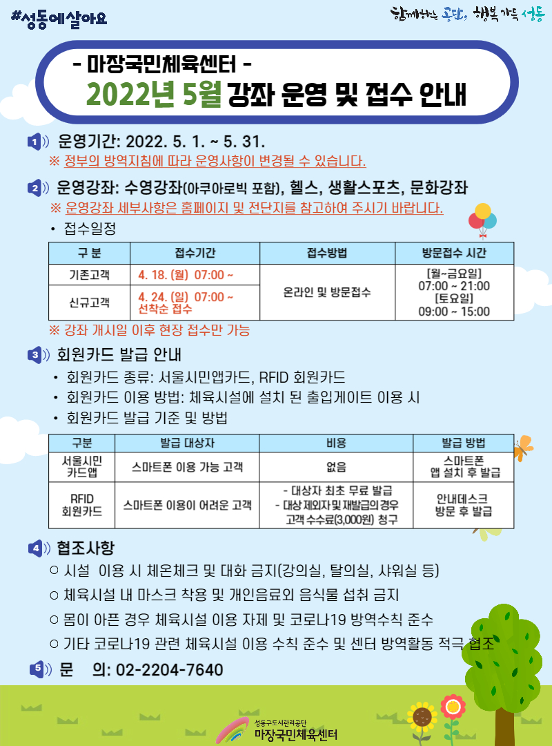 [마장국민체육센터] 5월 강좌 운영 및 접수 안내 작성자 관리자 등록일자 2022년 4월 15일 10시 57분 4초 조회 1,032 2022년 5월 강좌 운영 및 접수 안내(마장).jpg [ Size : 529.13KB , Down : 680 ] 미리보기 다운로드 목록보기