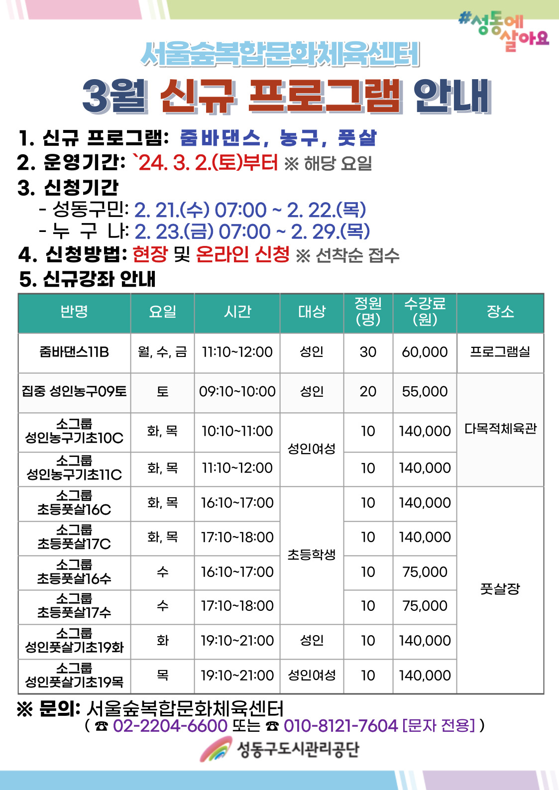 [서울숲복합문화체육센터] 3월 신규 강좌 안내 작성자 관리자 등록일자 2024년 2월 15일 12시 51분 8초 조회 811 3월 신규강좌 안내문.jpg [ Size : 356.14KB , Down : 397 ] 미리보기 다운로드 목록보기