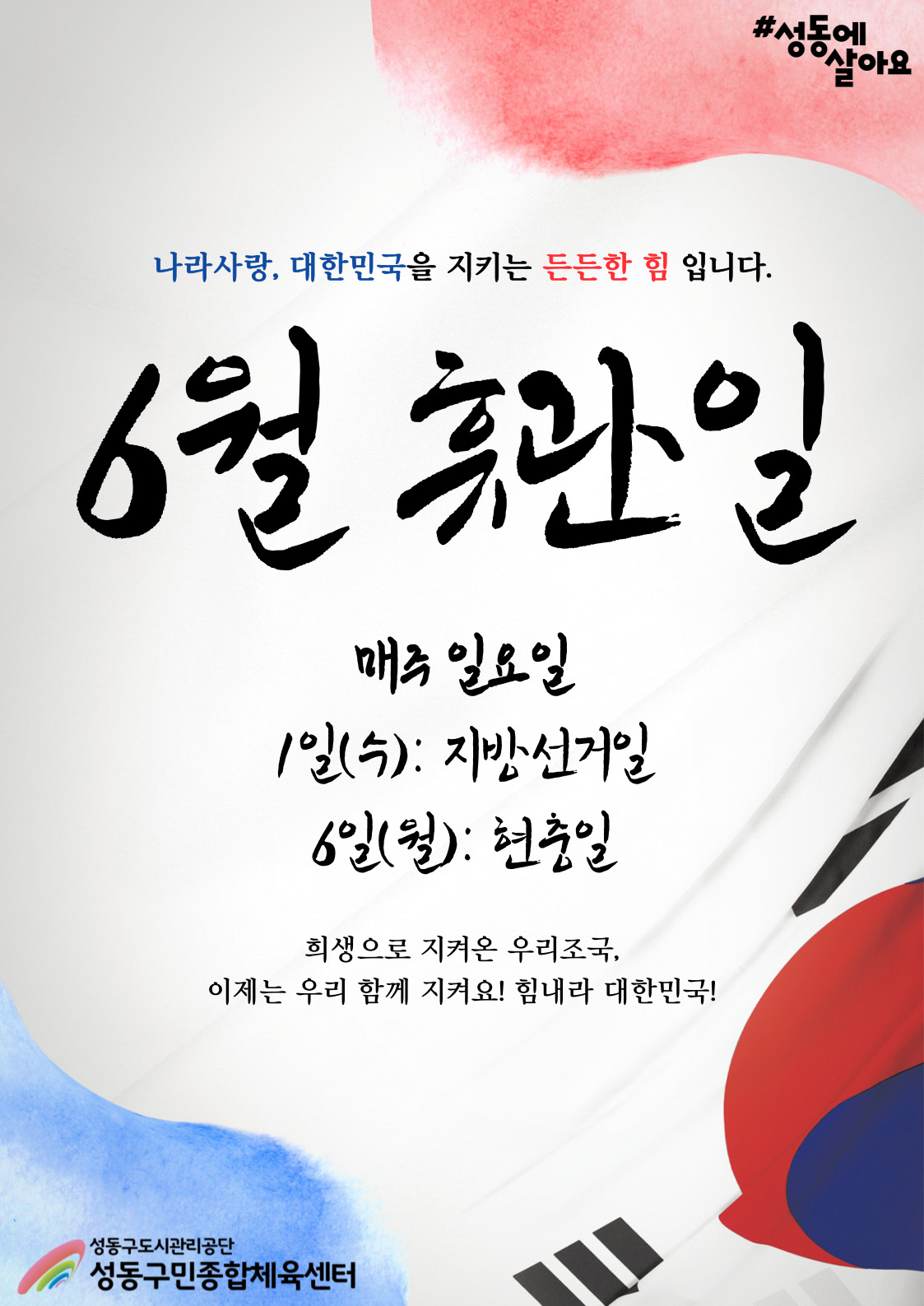 [성동구민종합체육센터] 6월 휴관 안내 작성자 관리자 등록일자 2022년 5월 30일 18시 55분 54초 조회 1,412 22년도6월.jpg [ Size : 331.94KB , Down : 1,014 ] 미리보기 다운로드 목록보기