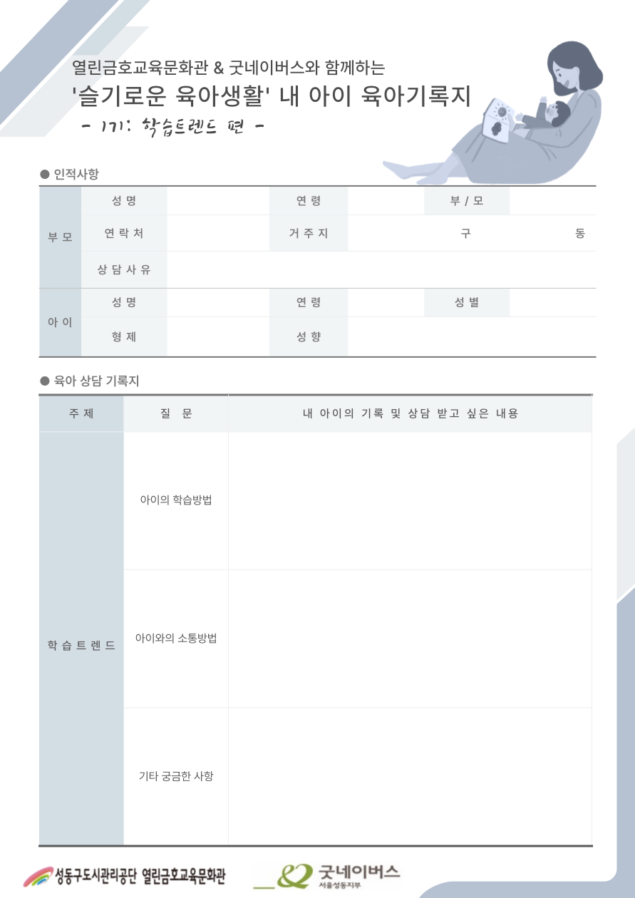 ※ 모집 후 선정 대상자(추첨 선정자)는 상담에 필요한 첨부 된 육아기록지를 작성해서 메일로 제출해주세요.