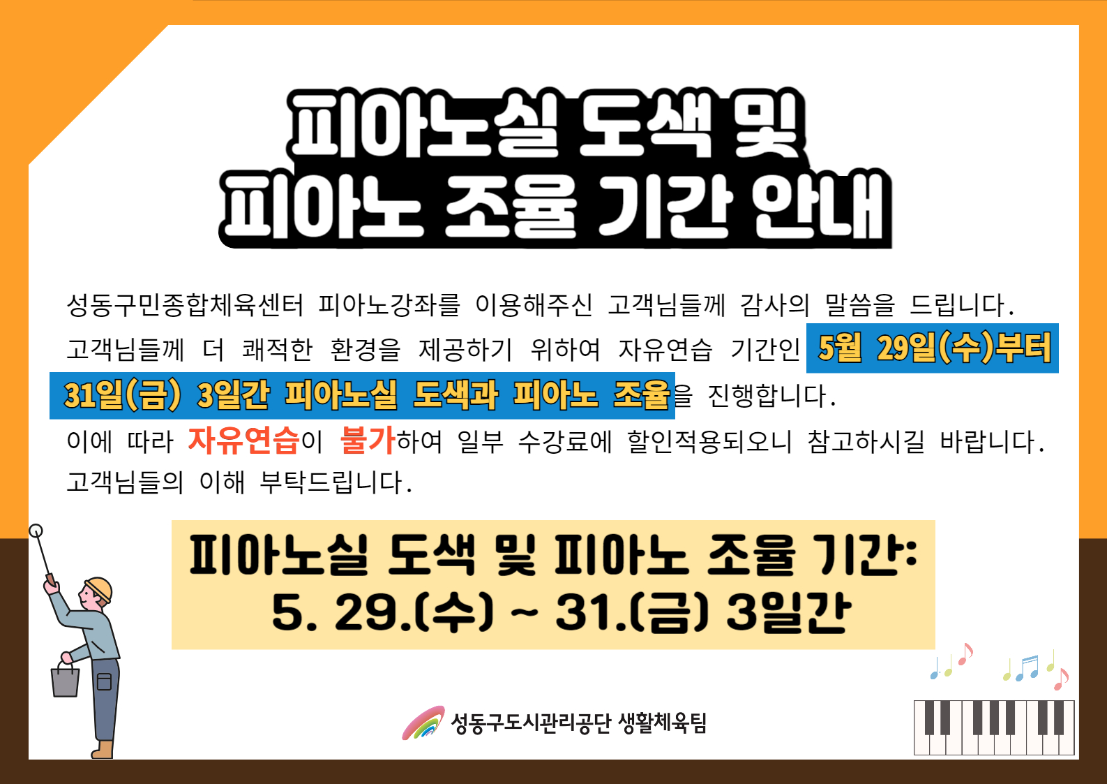 [성동구민종합체육센터] 피아노 교실 도색 및 피아노 조율 안내 작성자 관리자 등록일자 2024년 4월 15일 9시 1분 9초 조회 1,101 쾌적한 환경을 제공하기 위하여 5월 자유연습기간동안 피아노실 도색 및 피아노 조율을 진행합니다.이에 따라 5월 자유연습이 불가하오니 참고하시길 바랍니다.- 기간: 5. 29.(수) ~ 31.(금) 3일간 문화강좌 휴강안내-001.jpg [ Size : 539.62KB , Down : 866 ] 미리보기 다운로드 목록보기