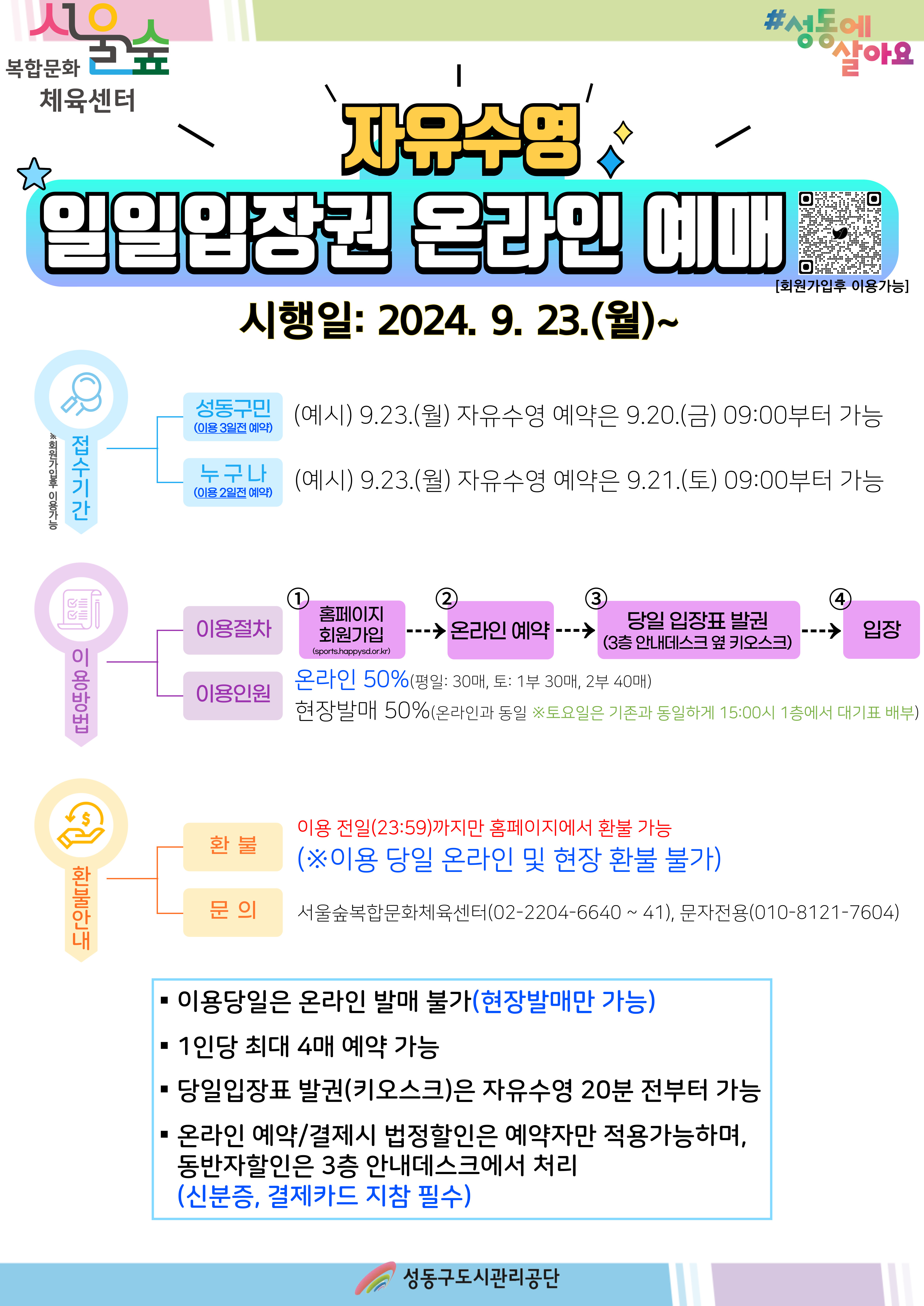서울숲복합문화체육센터 자유수영 일일입장권 온라인 예매 안내 작성자 관리자 등록일자 2024년 9월 12일 14시 26분 48초 조회 2,405 <자유수영 일일입장권온라인 예매 안내> 서울숲복합문화체육센터는 9월 23일(월)부터 온라인에서 자유수영 일일입장권이 예매가가능하오니 많은 관심과 참여 바랍니다. 자유수영 일일입장 온라인 예매 안내_서울숲.jpg [ Size : 1.61MB , Down : 4,084 ] 미리보기 다운로드 목록보기