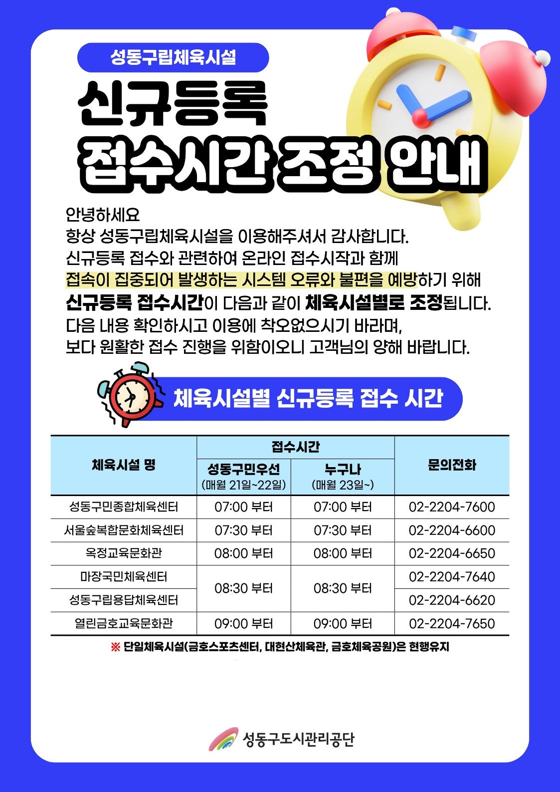 📢 성동구립체육시설 신규등록 접수시간 조정 안내