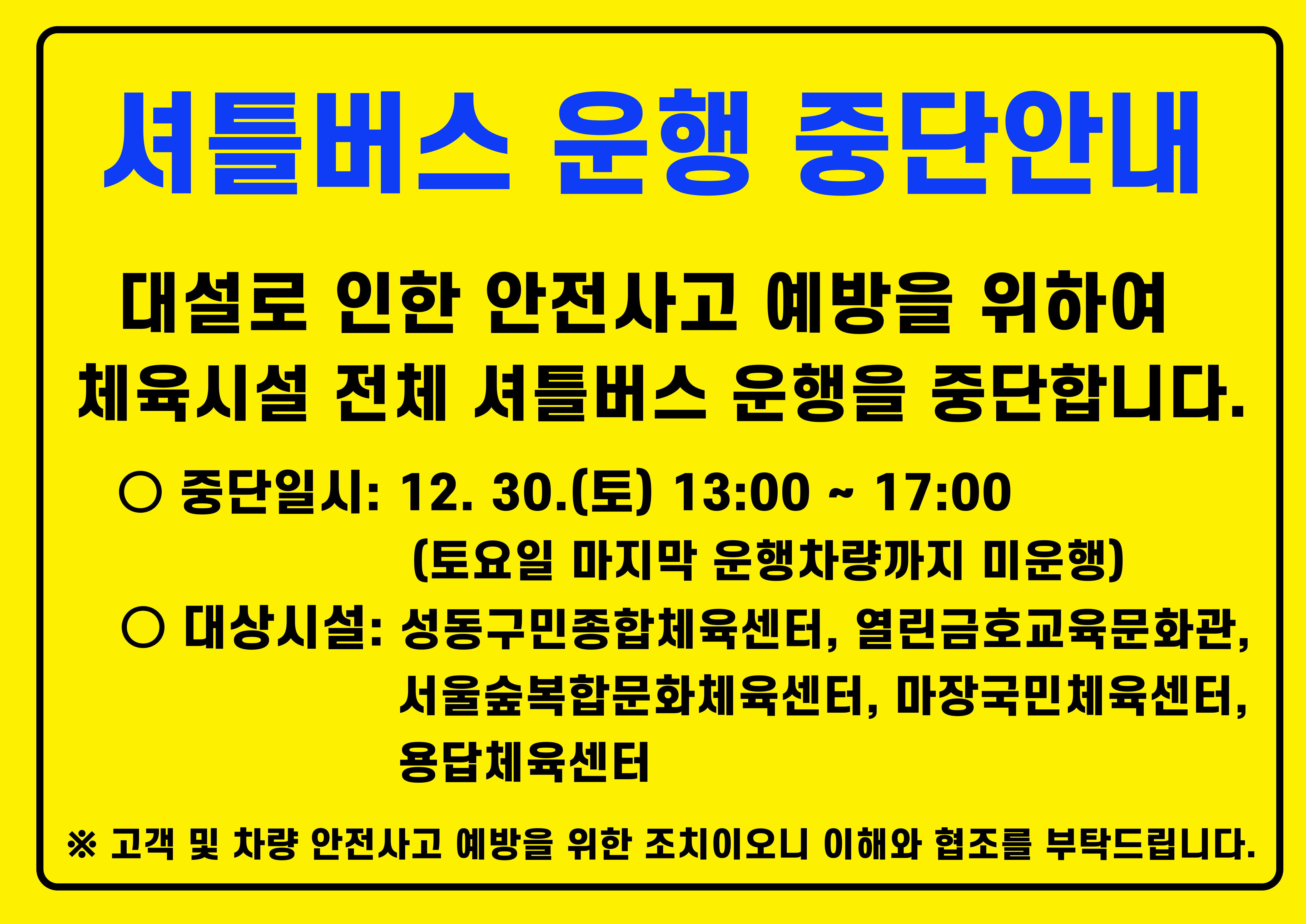 대설로 인한 체육시설 셔틀버스 운행중단 안내 작성자 관리자 등록일자 2023년 12월 30일 14시 14분 50초 조회 527 셔틀버스 운행중단 안내문.jpg [ Size : 1.45MB , Down : 425 ] 미리보기 다운로드 목록보기