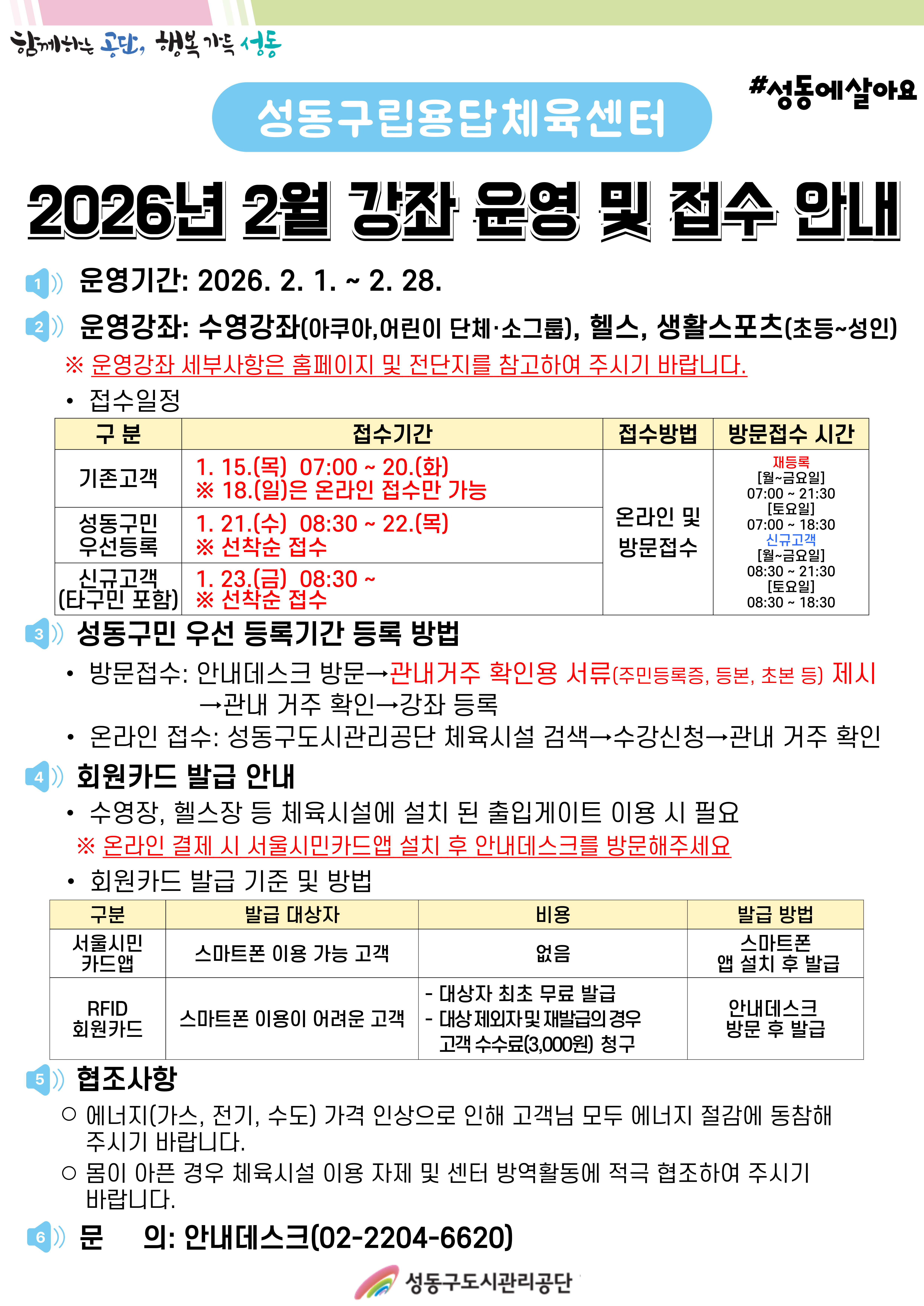 공지 [용답체육센터] 2026년 2월 강좌 접수 및 재등록 안내 작성자 관리자 등록일자 2026년 1월 14일 14시 37분 23초 조회 45 용답-재등록-2월-001.jpg [ Size : 2.67MB , Down : 4 ] 미리보기 다운로드 목록보기