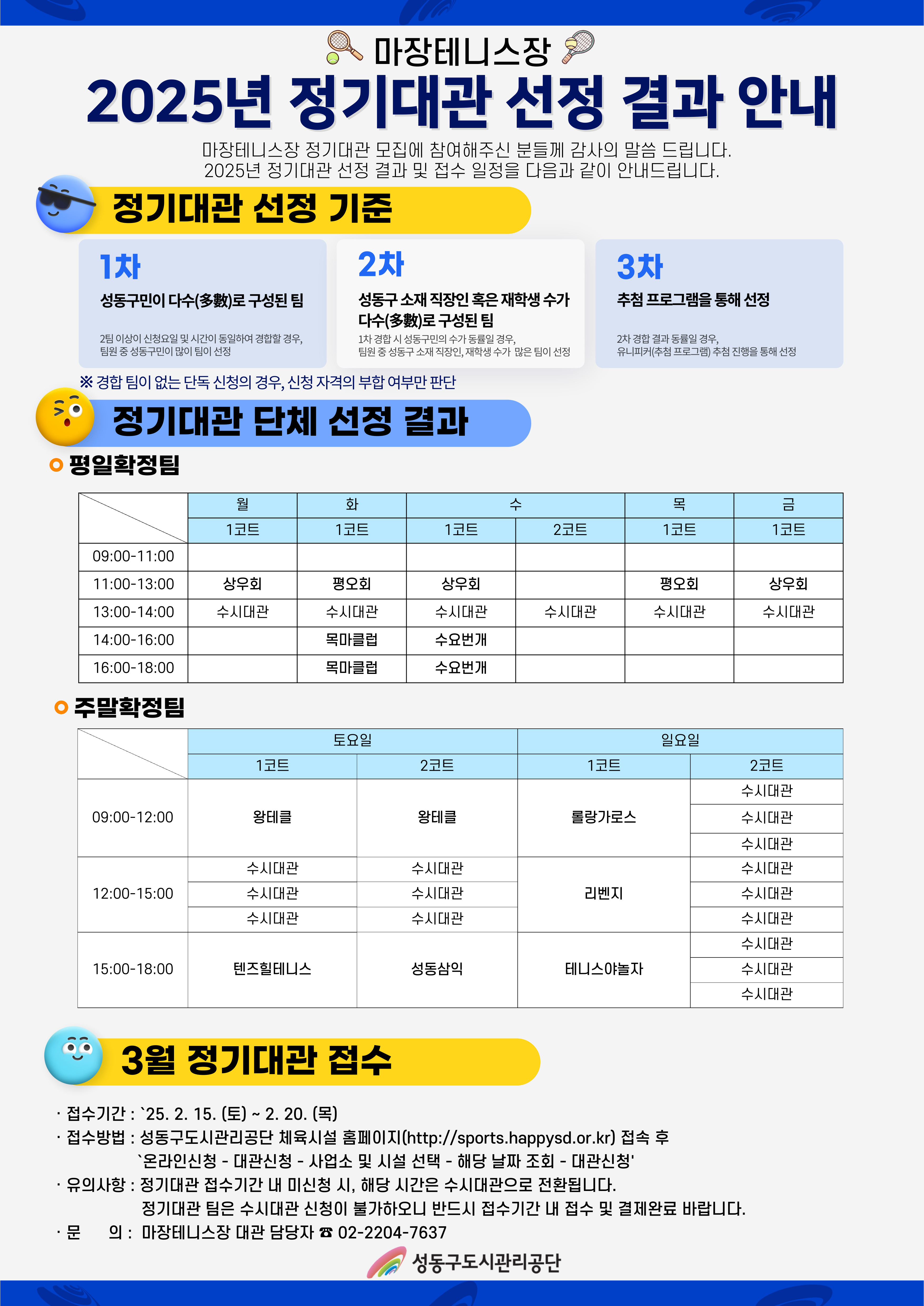 2025년 마장테니스장 정기대관 배정 선정 결과 안내 작성자 관리자 등록일자 2025년 2월 13일 10시 39분 33초 조회 429 2025년정기대관선정결과_마장테니스장_-001 (1).jpg [ Size : 1.48MB , Down : 436 ] 미리보기 다운로드 정기대관 접수 현황표.xlsx [ Size : 14.04KB , Down : 280 ] 다운로드 목록보기