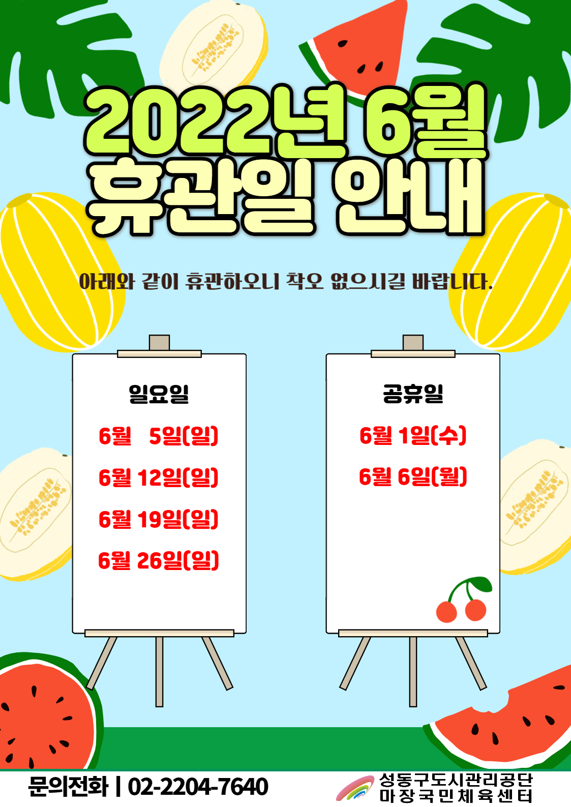[마장국민체육센터] 6월 휴관일 안내 작성자 관리자 등록일자 2022년 5월 31일 10시 9분 3초 조회 1,022 2022년 6월 휴관일 안내(마장).jpg [ Size : 840.9KB , Down : 589 ] 미리보기 다운로드 목록보기