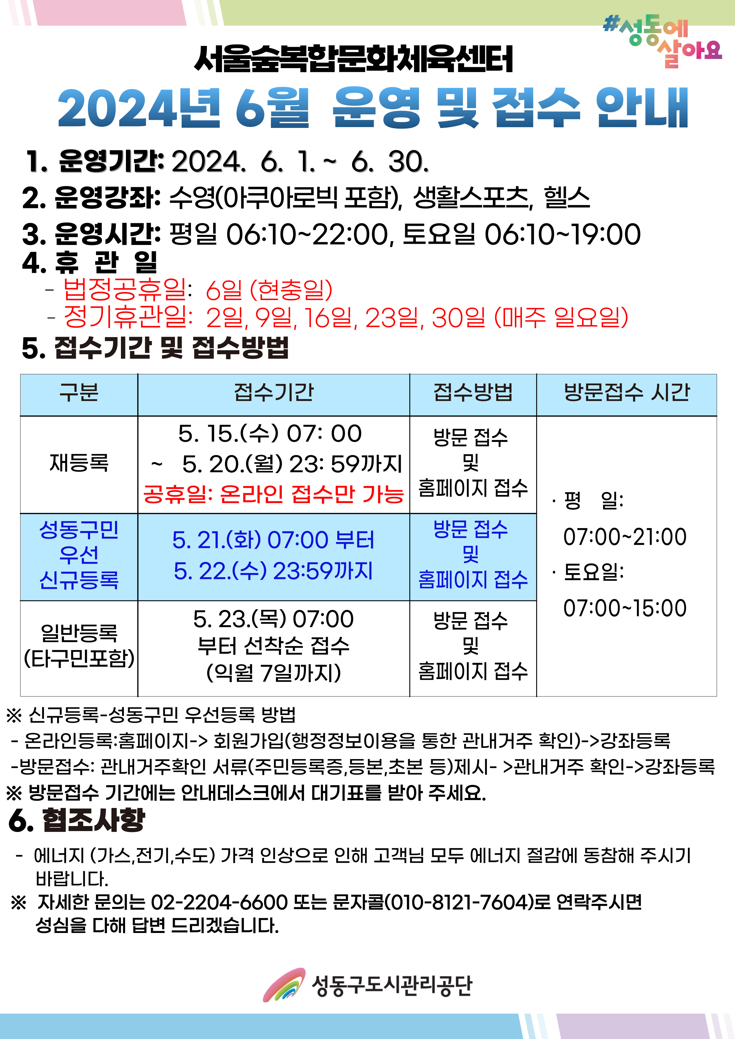 서울숲복합문화체육센터 6월 운영 및 접수 안내