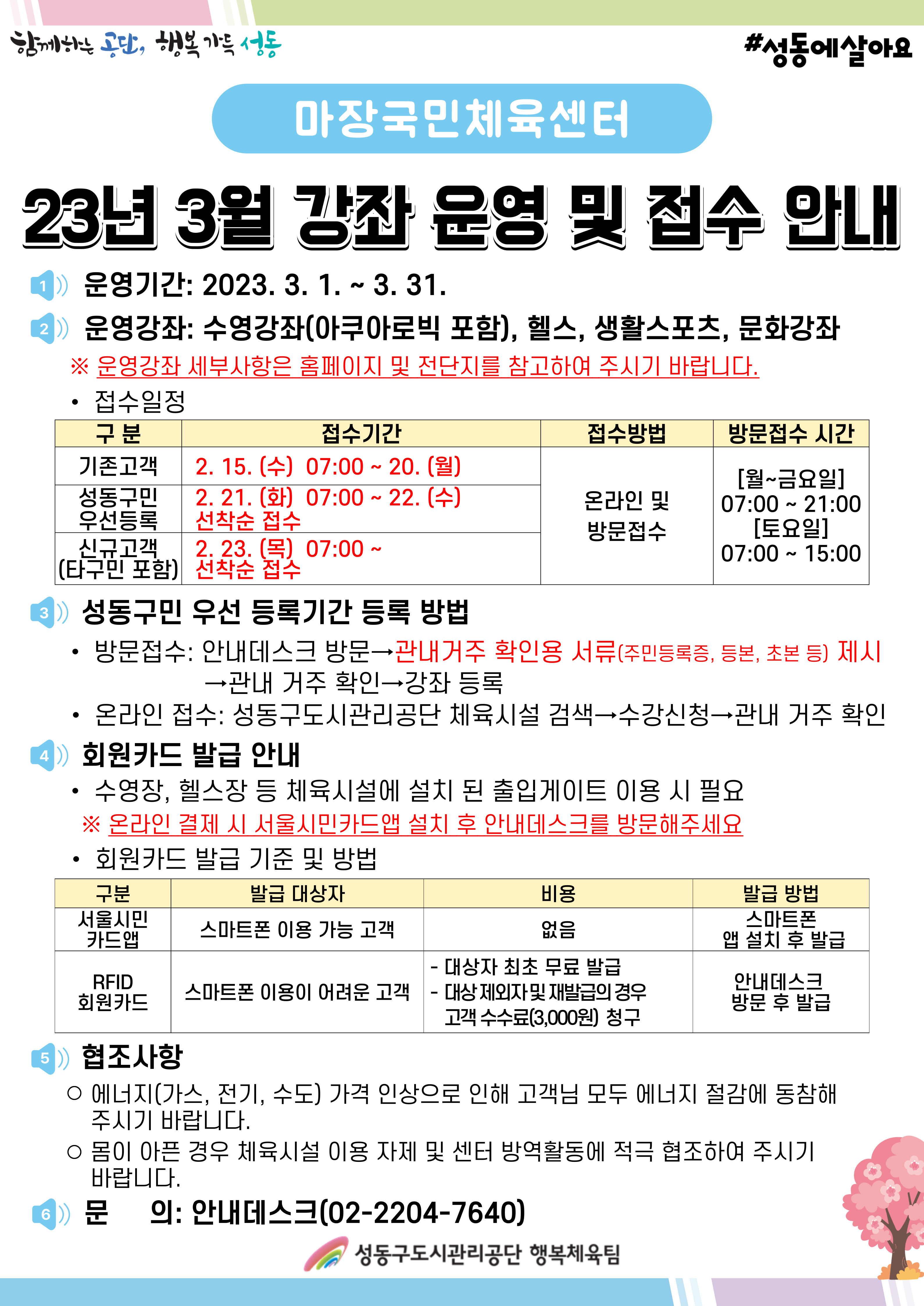 [마장국민체육센터] 2023년 3월 강좌 운영 및 접수 안내 작성자 관리자 등록일자 2023년 2월 14일 11시 22분 31초 조회 998 2023년 3월 강좌 운영 및 접수 안내(마장).jpg [ Size : 1.53MB , Down : 791 ] 미리보기 다운로드 목록보기