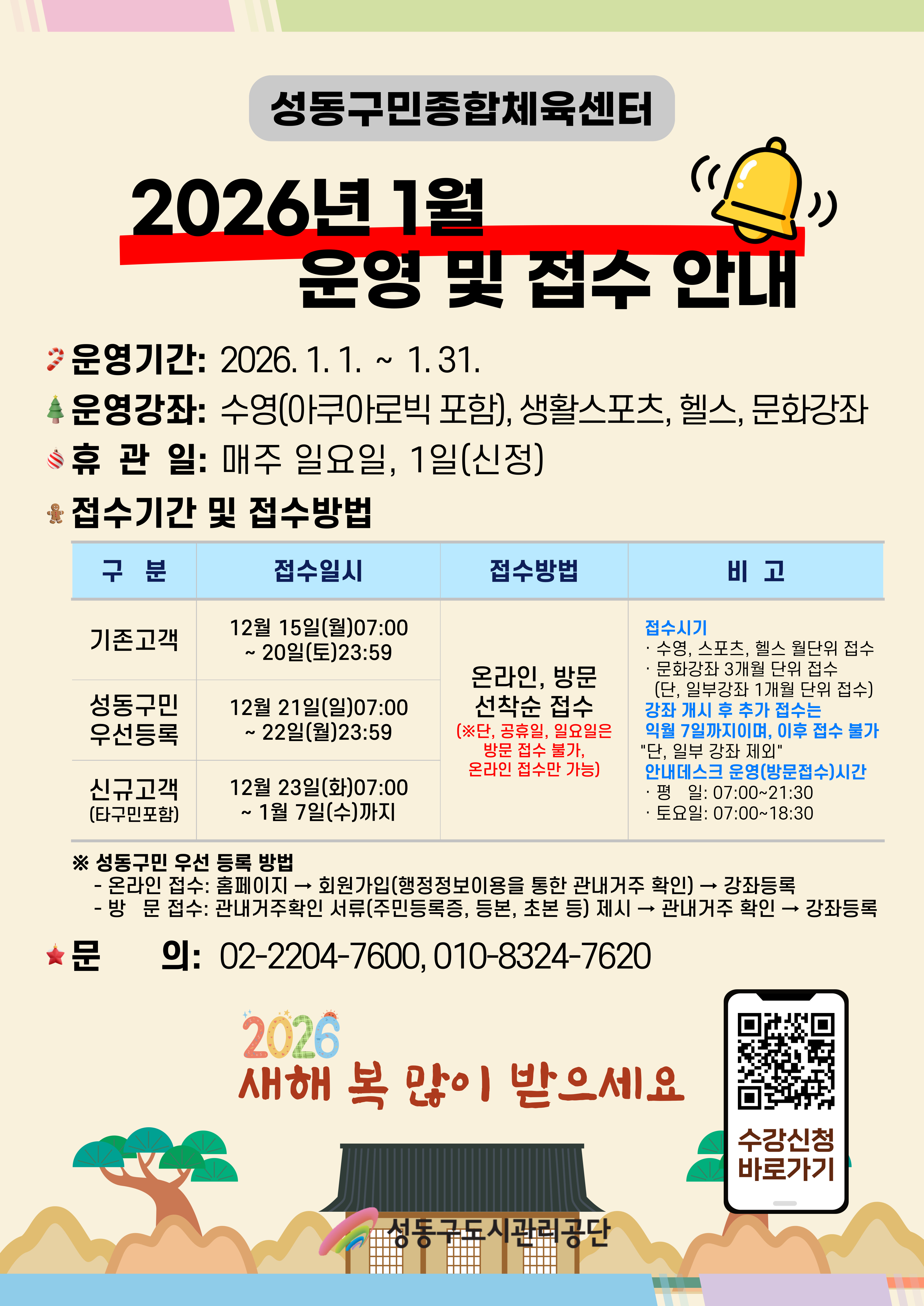 공지 [성동구민종합체육센터] 2026년 1월 운영 및 접수안내 작성자 관리자 등록일자 2025년 12월 15일 11시 4분 14초 조회 445 ○ 접수기간 - [재등록 고객] 12. 15.(월) 07:00 ~ 20.(토) 23:59 ※ 단, 법정공휴일, 일요일은 온라인접수만 가능 - [신규등록-성동구민 우선 등록 고객] 12. 21.(일) 07:00 ~ 22.(월) 23:59 - [신규등록-일반등록(타구민 포함) 고객] 12. 23.(화) 07:00 ~ 1. 7.(수) 선착순 접수 1월 운영, 접수안내.jpg [ Size : 1.68MB , Down : 107 ] 미리보기 다운로드 목록보기