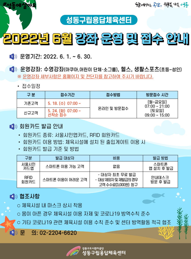 [용답체육센터] 6월 강좌 운영 및 접수 안내 작성자 관리자 등록일자 2022년 5월 17일 14시 50분 9초 조회 1,124 2022년 6월 강좌 운영 및 접수 안내(용답).jpg [ Size : 529.74KB , Down : 763 ] 미리보기 다운로드 목록보기