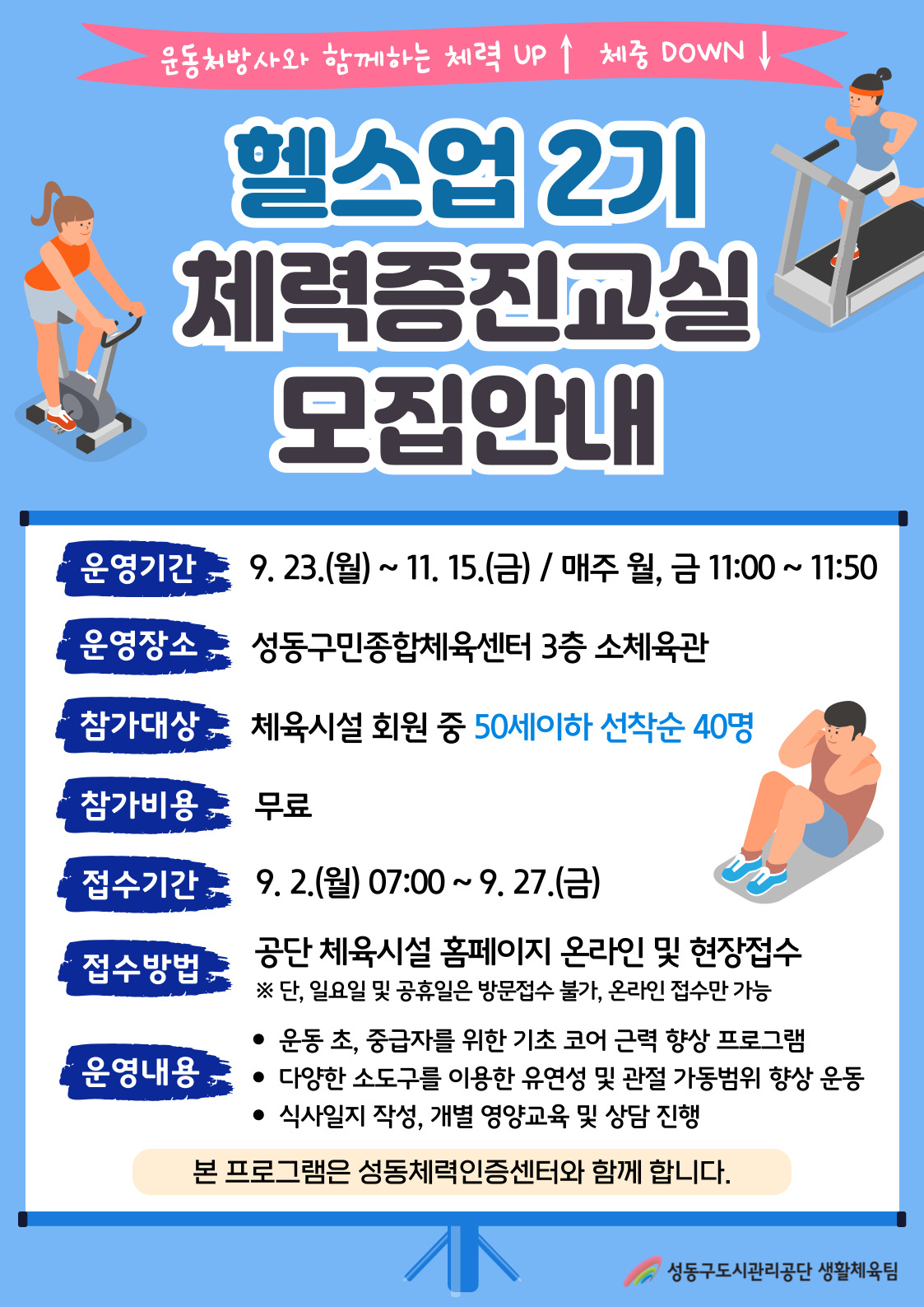 [성동구민종합체육센터] 헬스업 2기 체력증진교실 모집 안내 작성자 관리자 등록일자 2024년 8월 27일 11시 42분 5초 조회 1,658 운동처방사와 함께 체계적으로 전문적으로 운동해 보세요~ 무료 입니다!!다음 내용 확인하시고 등록하세요~ 24헬스업-1기-모집안내문-001.jpg [ Size : 410.27KB , Down : 1,945 ] 미리보기 다운로드 목록보기