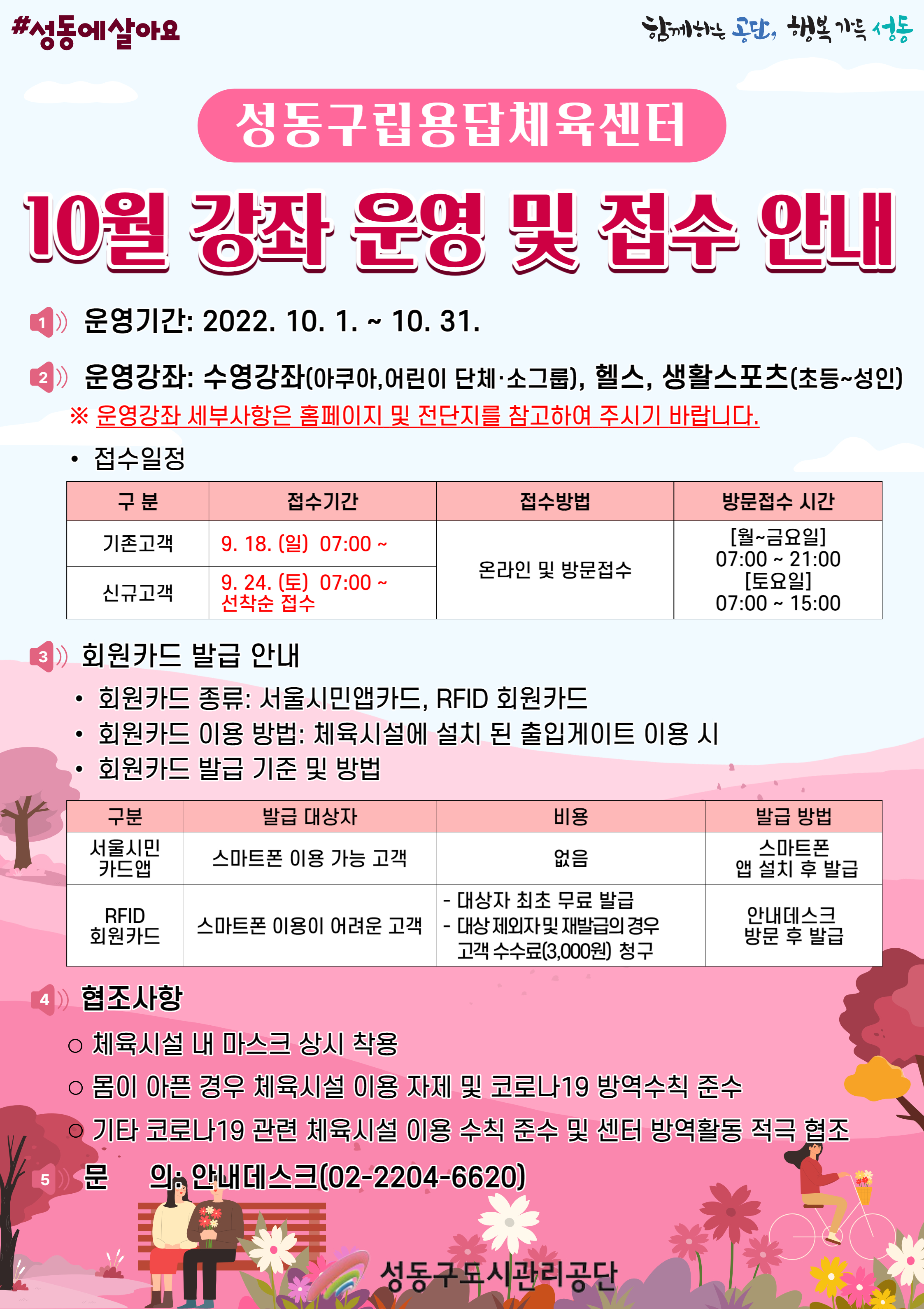 [용답체육센터] 10월 강좌 운영 및 접수 안내 작성자 관리자 등록일자 2022년 9월 13일 10시 58분 15초 조회 880 2022년 10월 강좌 운영 및 접수 안내(용답).jpg [ Size : 2.19MB , Down : 846 ] 미리보기 다운로드 목록보기