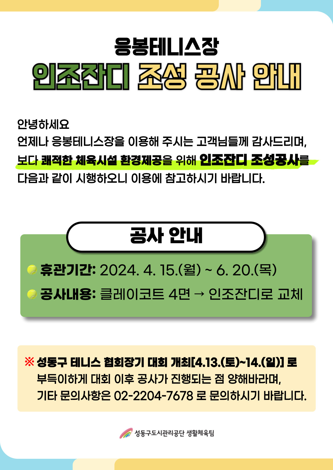 [응봉테니스장] 인조잔디 조성 공사 안내 작성자 관리자 등록일자 2024년 4월 1일 14시 24분 47초 조회 1,062 응봉테니스장 클레이코트가 인조잔디 코드로 변신합니다~!!다음 내용 확인하시고 이용에 참고하시기 바랍니다. 인조잔디조성-001.jpg [ Size : 299.83KB , Down : 820 ] 미리보기 다운로드 목록보기