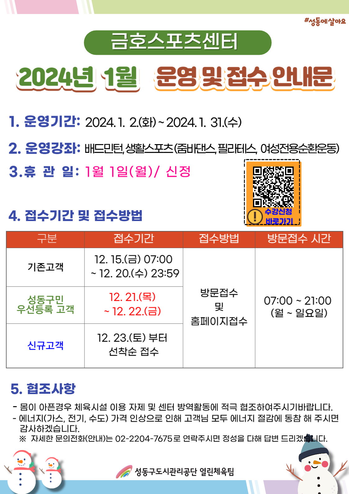 [금호스포츠] 2024년 1월 운영 및 접수 안내 작성자 관리자 등록일자 2023년 12월 22일 13시 30분 30초 조회 532 금호스포츠.png [ Size : 376.11KB , Down : 300 ] 미리보기 다운로드 목록보기