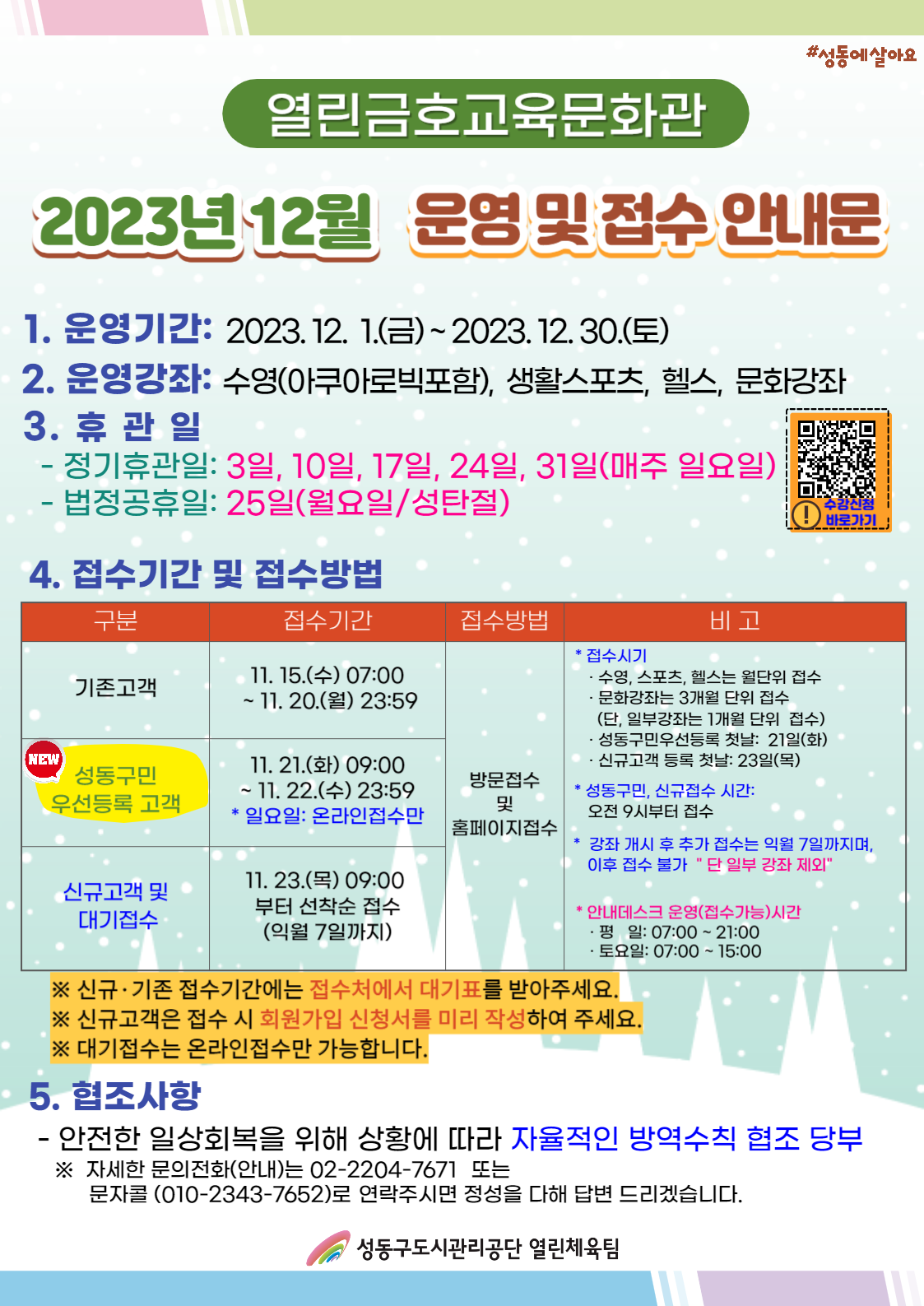 [열린금호교육문화관] 2023년 12월 운영 및 접수 안내문 작성자 관리자 등록일자 2023년 11월 14일 17시 1분 23초 조회 657 12월 열금.png [ Size : 599.36KB , Down : 480 ] 미리보기 다운로드 목록보기