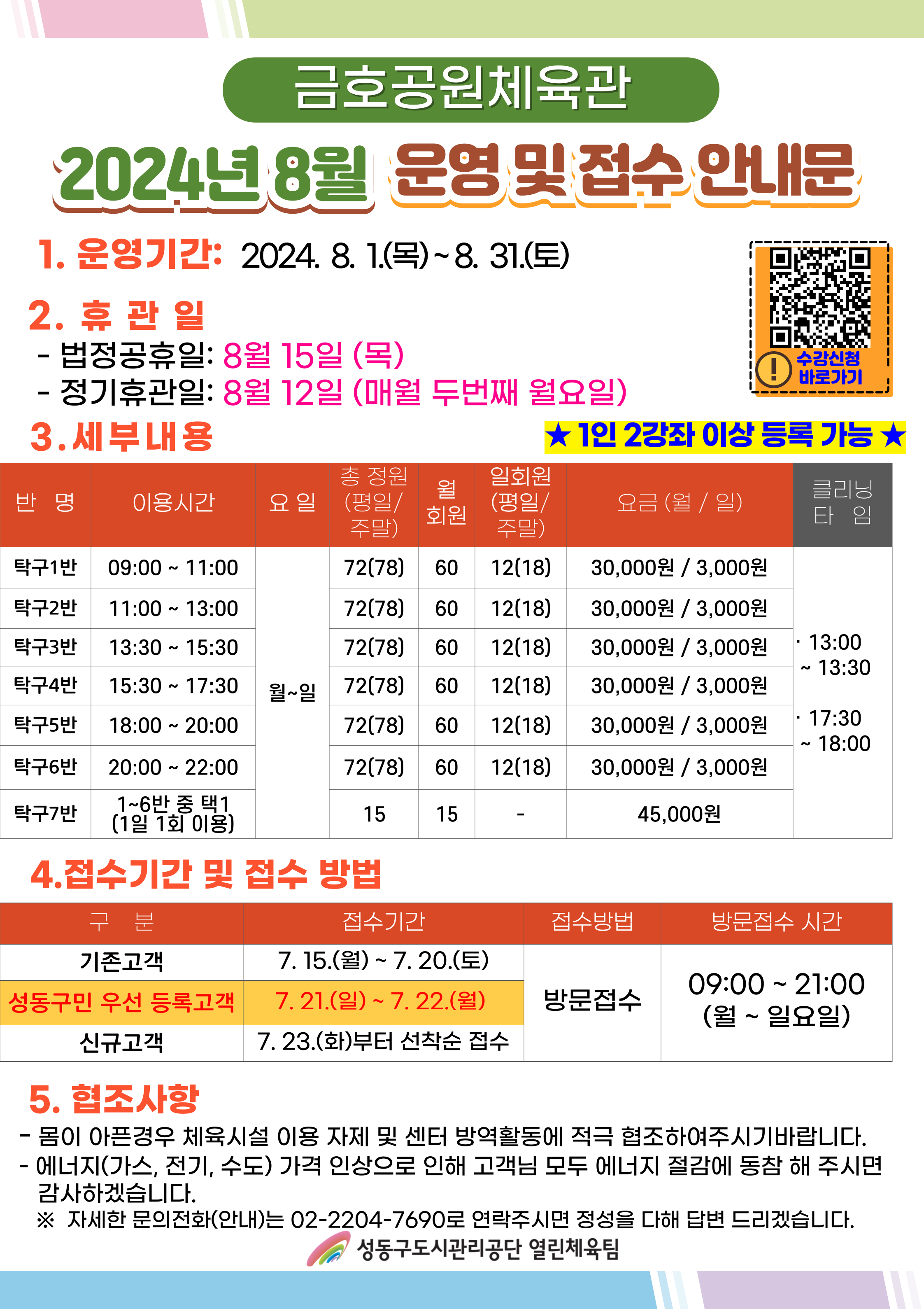 금호공원체육관 8월 운영 및 접수 안내 작성자 관리자 등록일자 2024년 7월 22일 10시 2분 14초 조회 632 <금호공원체육관 8월 운영 및 접수 안내> 8월 금호공원 운영 및 접수 안내문.png [ Size : 778.22KB , Down : 386 ] 미리보기 다운로드 목록보기