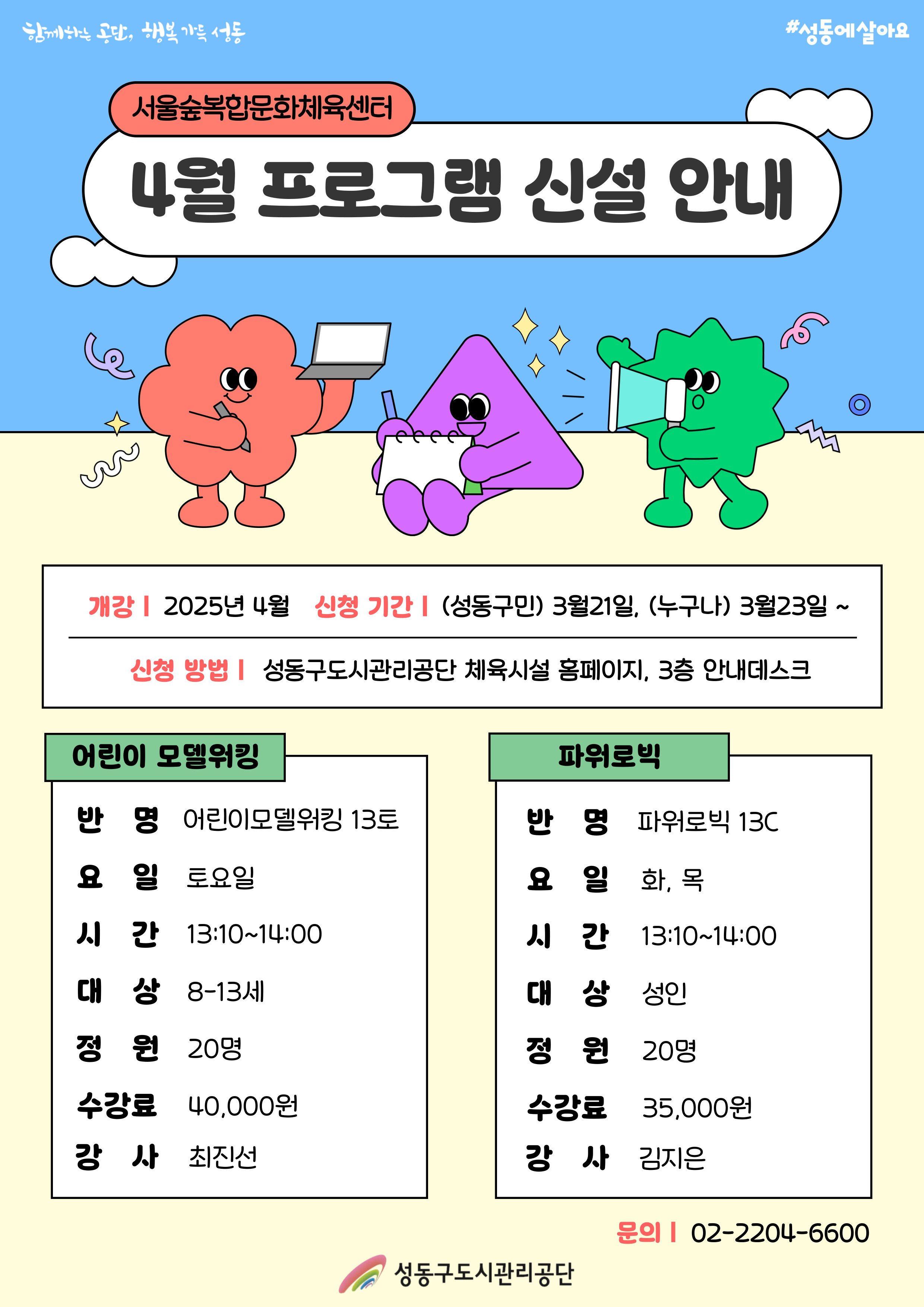 [서울숲복합문화체육센터] 4월 프로그램 신설 안내 작성자 관리자 등록일자 2025년 3월 14일 16시 16분 57초 조회 741 2025년 4월 프로그램 신설 안내문.jpg [ Size : 835.41KB , Down : 926 ] 미리보기 다운로드 목록보기