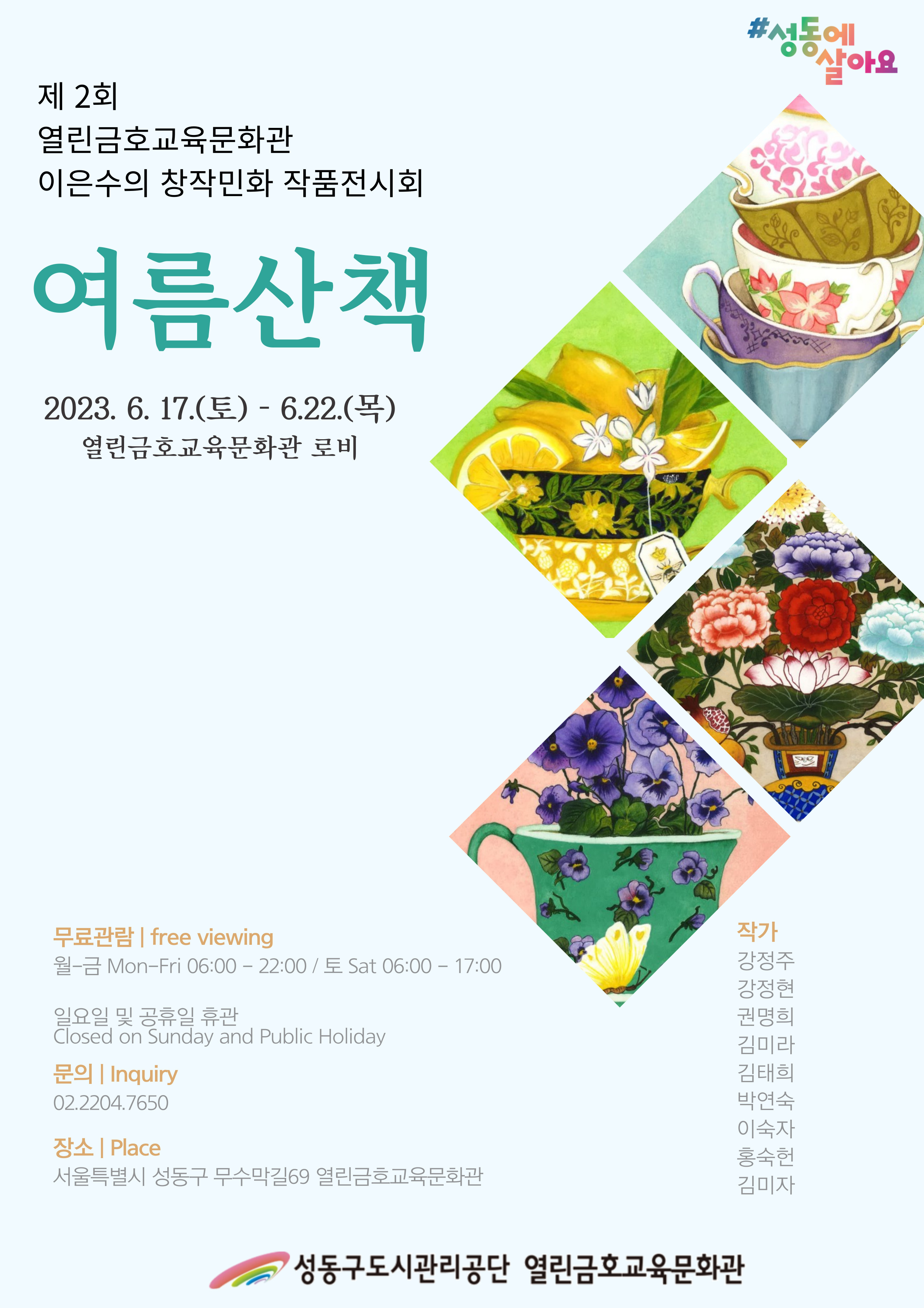 [열린금호교육문화관] 제2회 이은수의 창작민화 작품전시회 작성자 관리자 등록일자 2023년 6월 16일 17시 15분 5초 조회 548 제2회 이은수의 창작민화.jpg [ Size : 1021.71KB , Down : 327 ] 미리보기 다운로드 목록보기