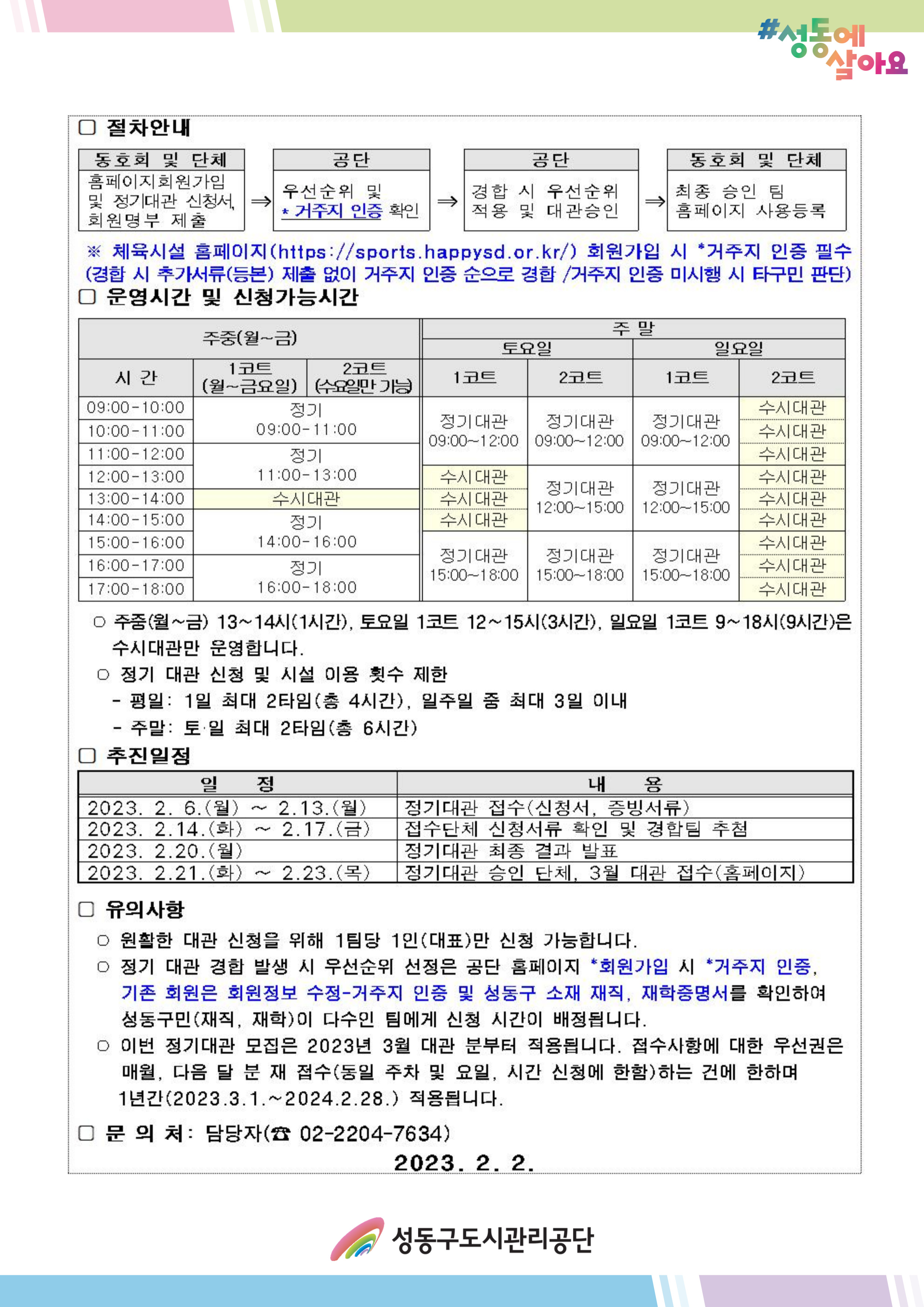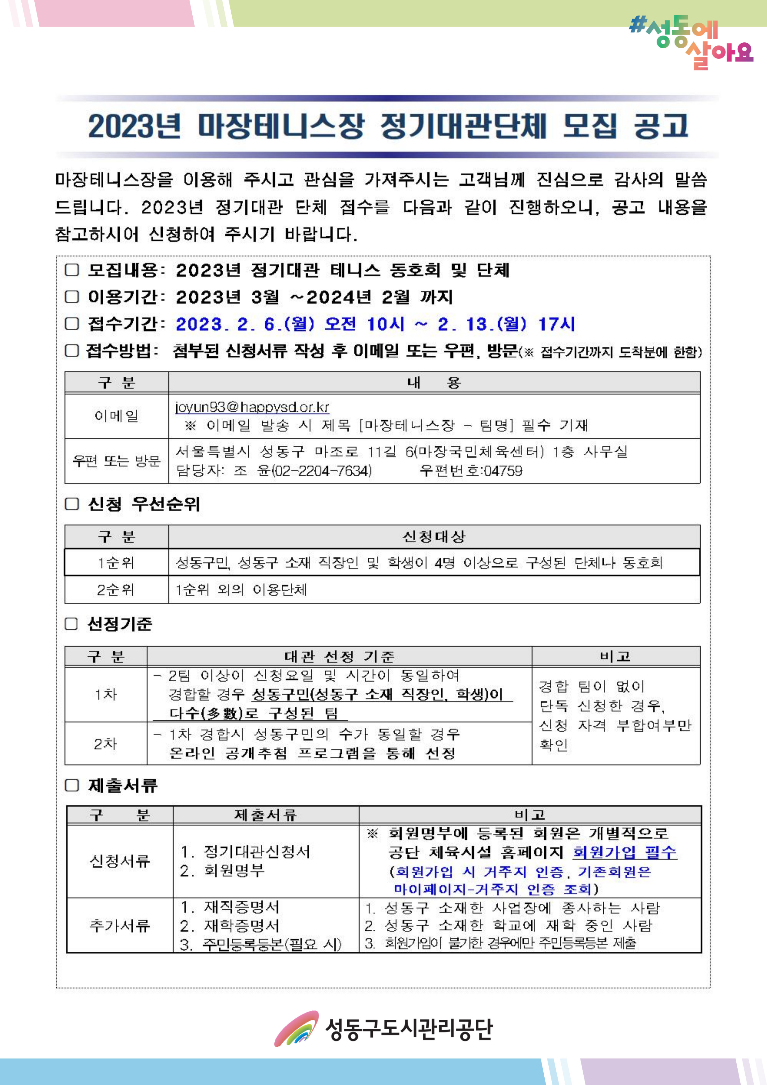 [마장테니스장] 2023년 마장테니스장 정기대관단체 모집 공고 작성자 관리자 등록일자 2023년 2월 2일 19시 53분 37초 조회 936 001.jpg [ Size : 1.02MB , Down : 752 ] 미리보기 다운로드 002.jpg [ Size : 1.18MB , Down : 718 ] 미리보기 다운로드 정기대관신청서 및 회원명부.hwp [ Size : 30KB , Down : 556 ] 다운로드 목록보기