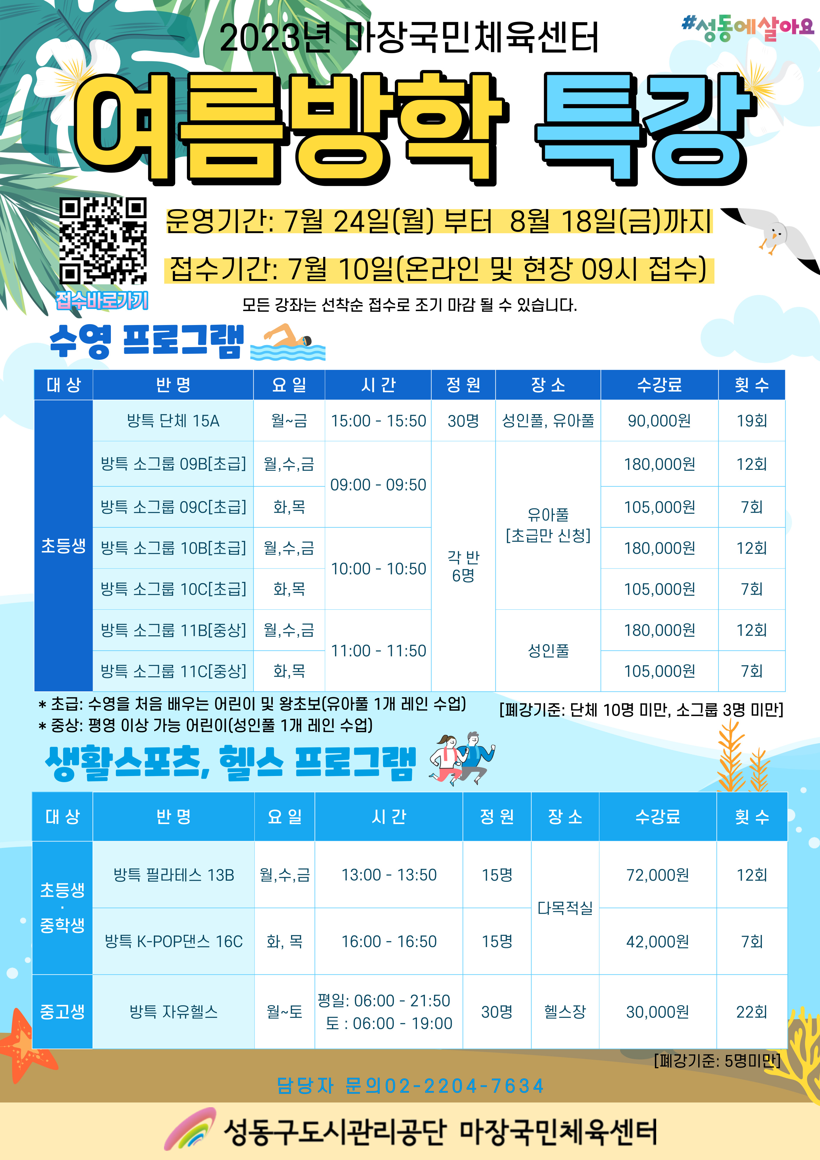 [마장국민체육센터] 2023년 여름방학특강 안내 작성자 관리자 등록일자 2023년 6월 29일 11시 43분 52초 조회 1,344 사본 -23년 여름방학특강 최종.jpg [ Size : 1.63MB , Down : 1,373 ] 미리보기 다운로드 목록보기