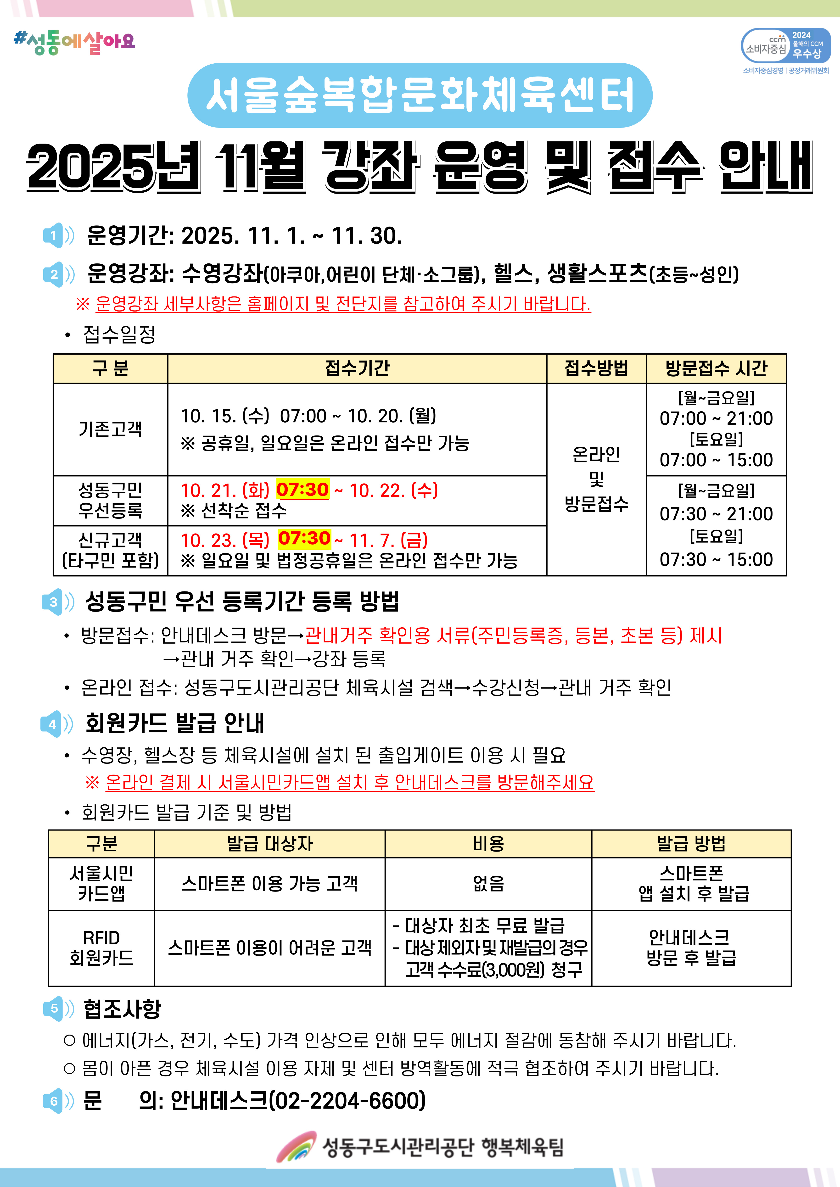 [서울숲복합문화체육센터] 11월 운영 및 접수 안내 작성자 관리자 등록일자 2025년 10월 15일 15시 16분 20초 조회 426 서울숲-접수안내-11월.jpg [ Size : 1.67MB , Down : 472 ] 미리보기 다운로드 목록보기