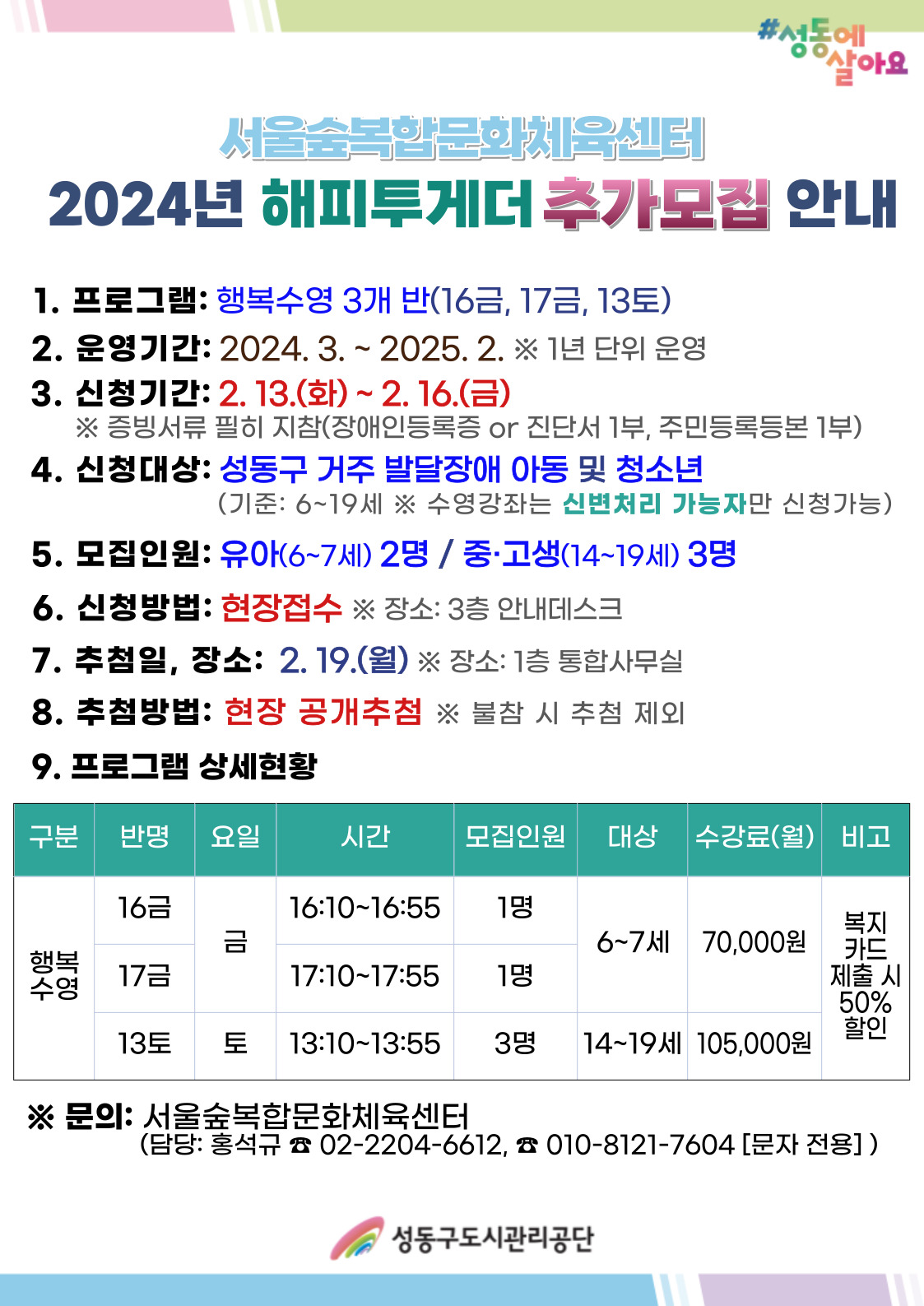 [서울숲복합문화체육센터] 2024년 해피투게더 추가모집 안내 작성자 관리자 등록일자 2024년 2월 8일 11시 25분 33초 조회 648 해피투게더 추가모집 안내문.jpg [ Size : 376.59KB , Down : 398 ] 미리보기 다운로드 해피투게더 추가모집 신청서(2024년).hwp [ Size : 16.5KB , Down : 324 ] 다운로드 목록보기