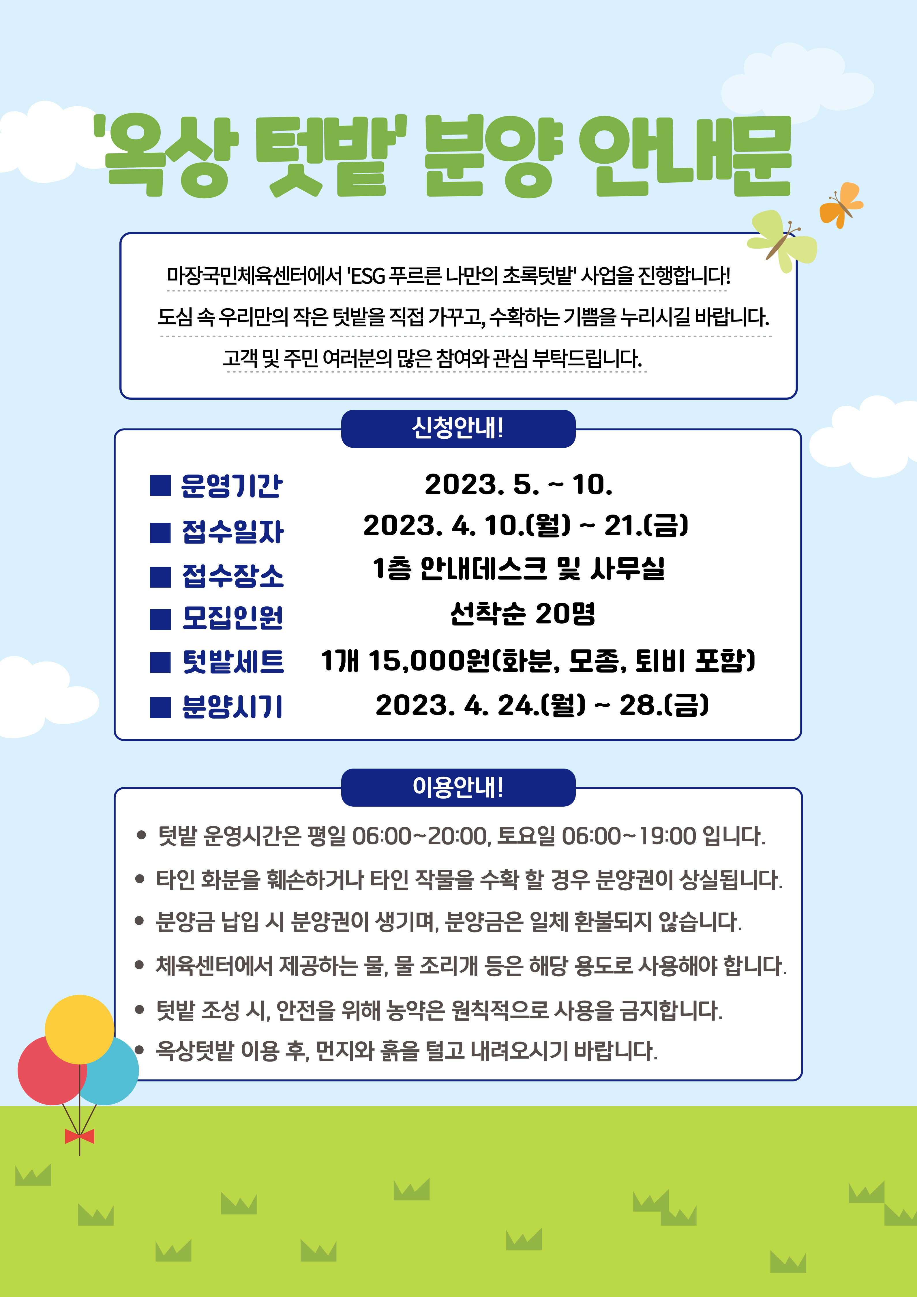 [마장국민체육센터] ESG 푸르른 나만의 초록텃밭 분양안내 작성자 관리자 등록일자 2023년 4월 11일 10시 13분 20초 조회 587 ESG 푸르른 나만의 초록텃밭 분양 안내.jpg [ Size : 1.08MB , Down : 321 ] 미리보기 다운로드 목록보기