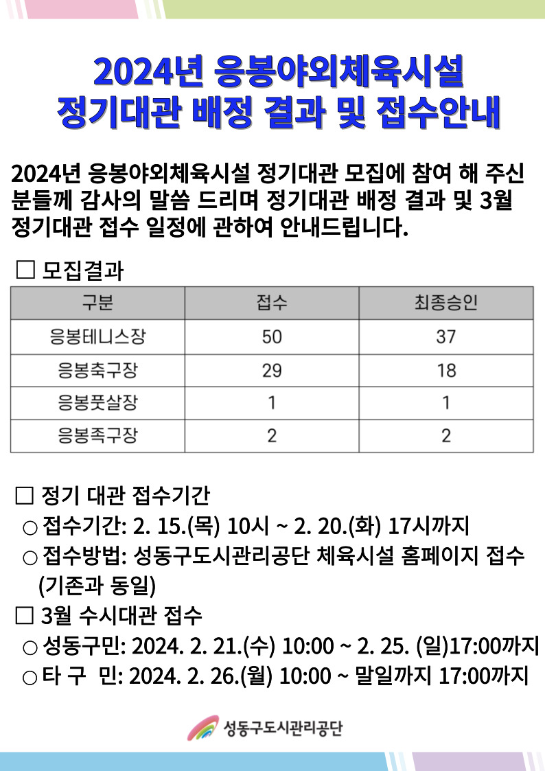 2024년 응봉야외체육시설 (테니스장)정기대관 배정결과 및 접수안내