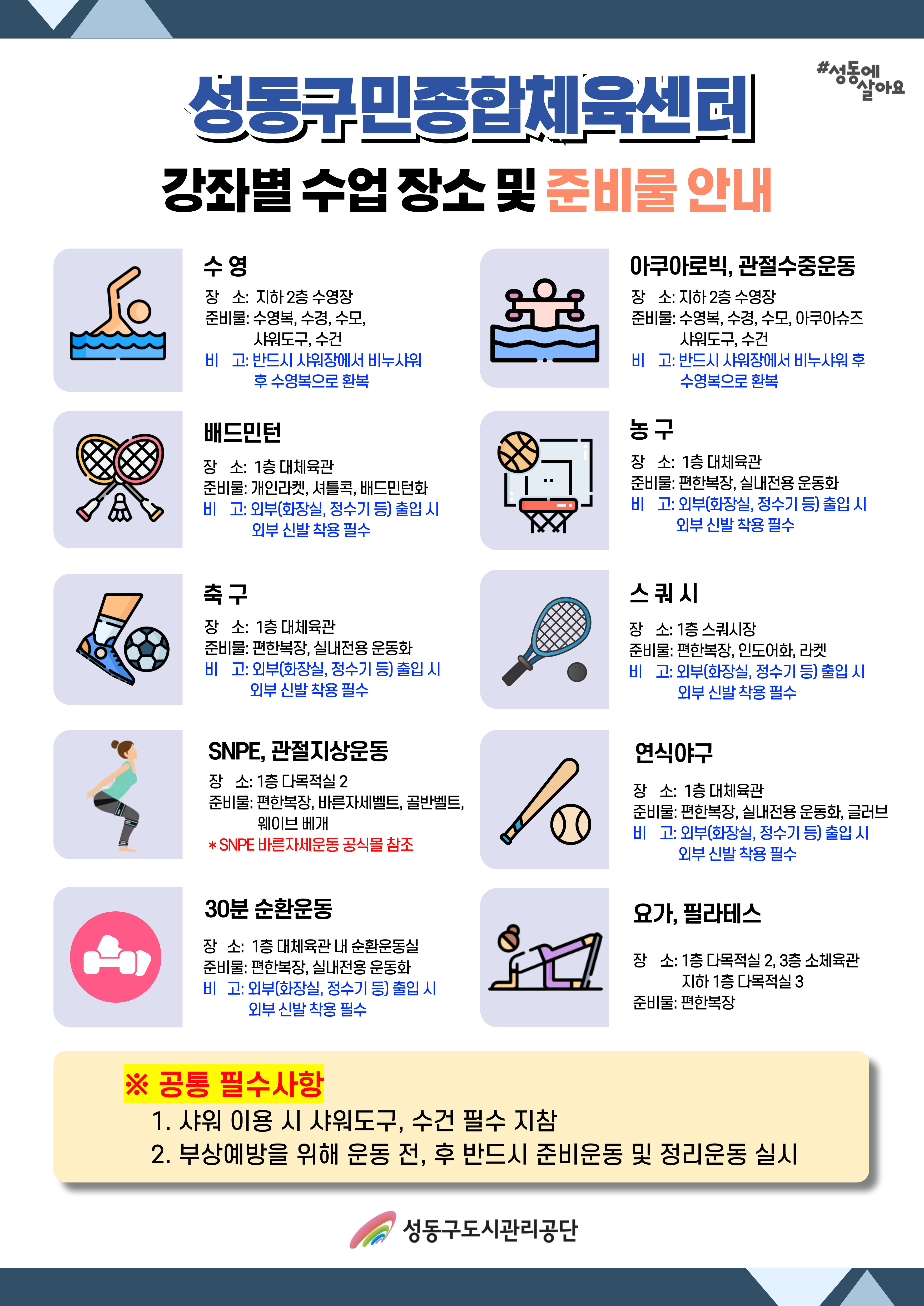 공지 [성동구민종합체육센터] 강좌별 수업 장소 및 준비물 안내 작성자 관리자 등록일자 2025년 7월 21일 15시 53분 51초 조회 893 성동구민종합체육센터 강좌별 수업 장소 및 준비물 안내 입니다.확인하시고 이용에 참고하시기 바랍니다. 001.jpg [ Size : 1.72MB , Down : 161 ] 미리보기 다운로드 002.jpg [ Size : 1.78MB , Down : 100 ] 미리보기 다운로드 목록보기