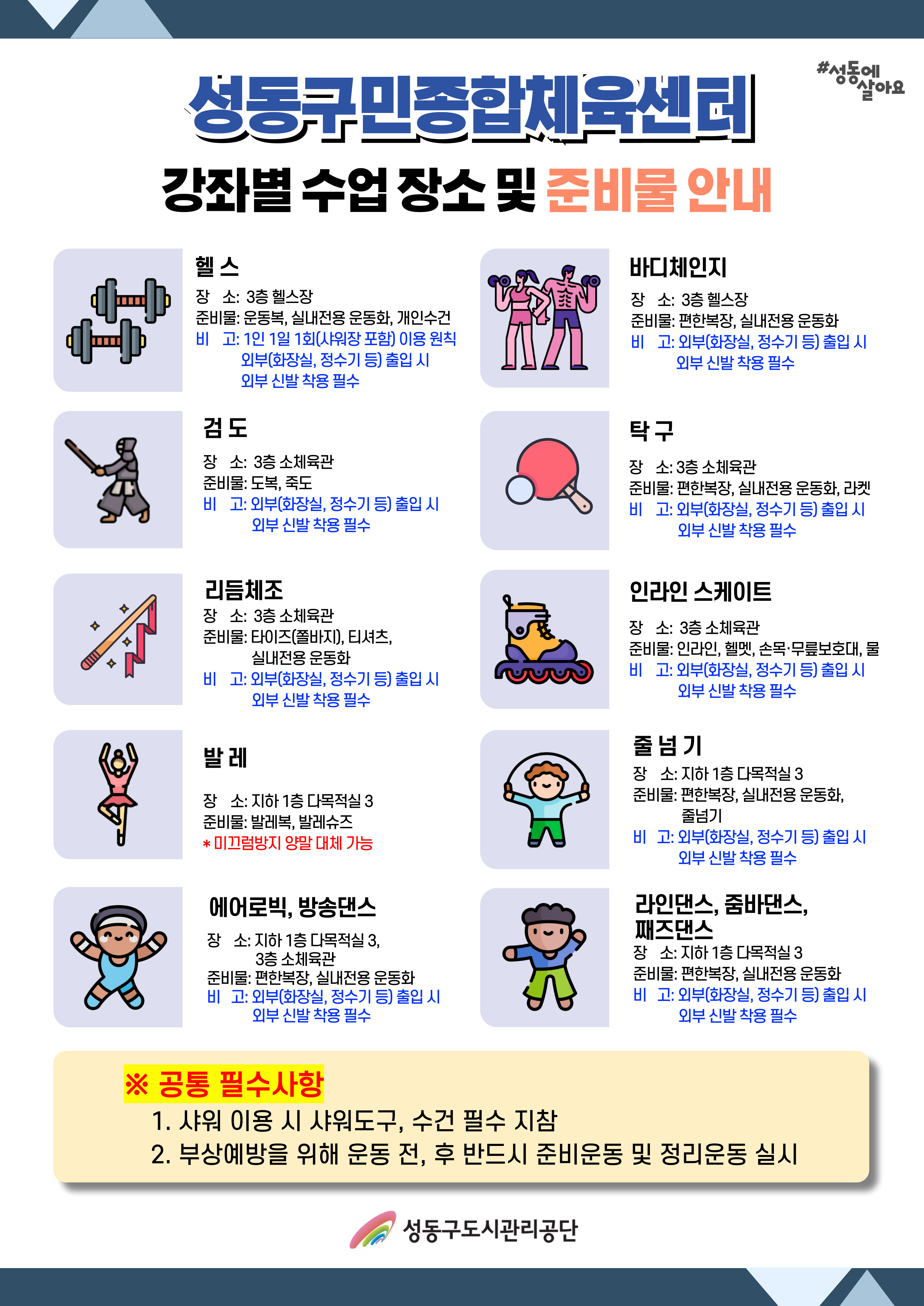 공지 [성동구민종합체육센터] 강좌별 수업 장소 및 준비물 안내 작성자 관리자 등록일자 2025년 7월 21일 15시 53분 51초 조회 893 성동구민종합체육센터 강좌별 수업 장소 및 준비물 안내 입니다.확인하시고 이용에 참고하시기 바랍니다. 001.jpg [ Size : 1.72MB , Down : 162 ] 미리보기 다운로드 002.jpg [ Size : 1.78MB , Down : 100 ] 미리보기 다운로드 목록보기