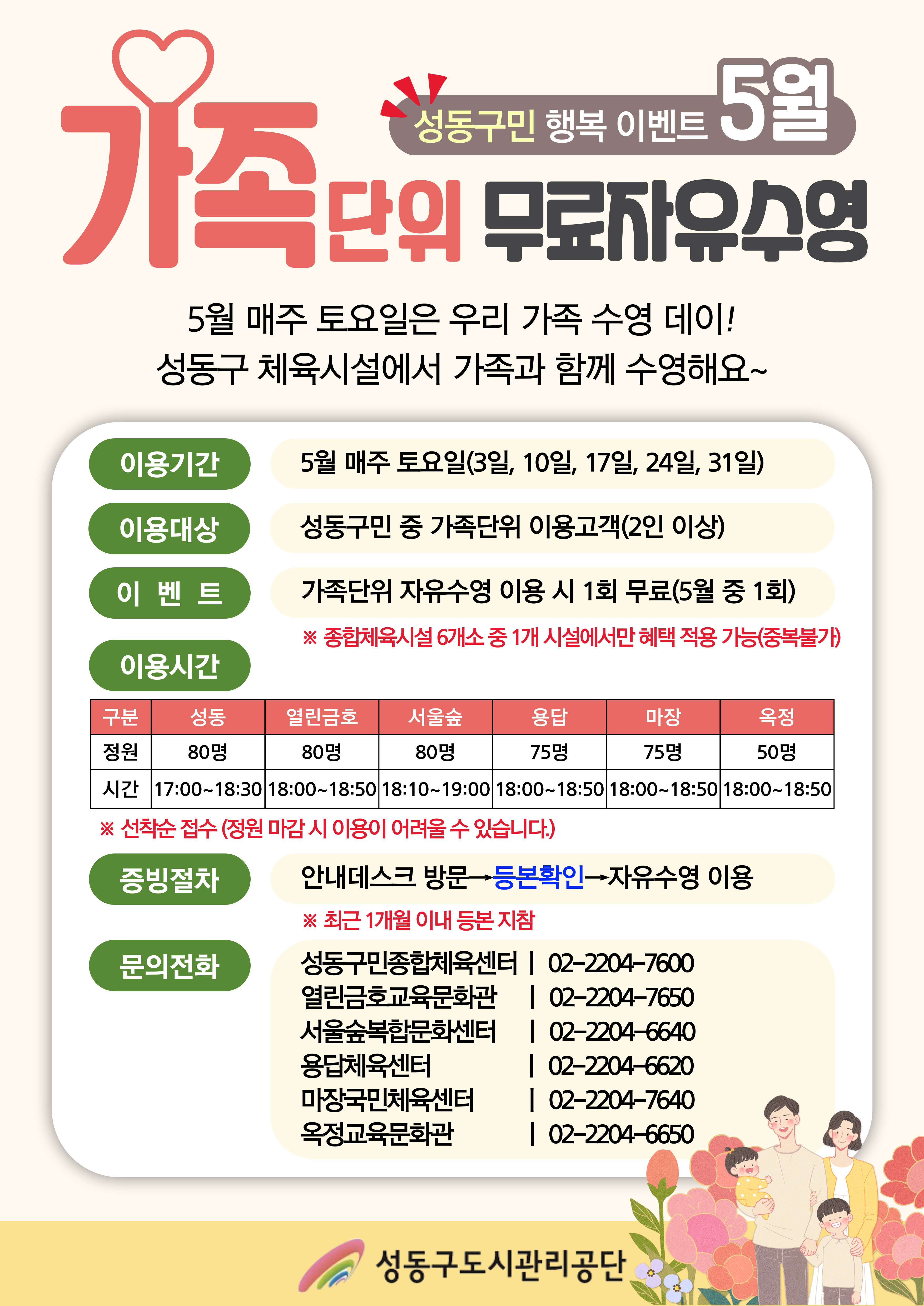 #가정의달 #성동구민종합체육센터 #가족수영 #수영이벤트 #가족이함께 #무료수영 #토요일행복타임 #성동구 #가족행사 #건강한가정 #자유수영 #행복센터