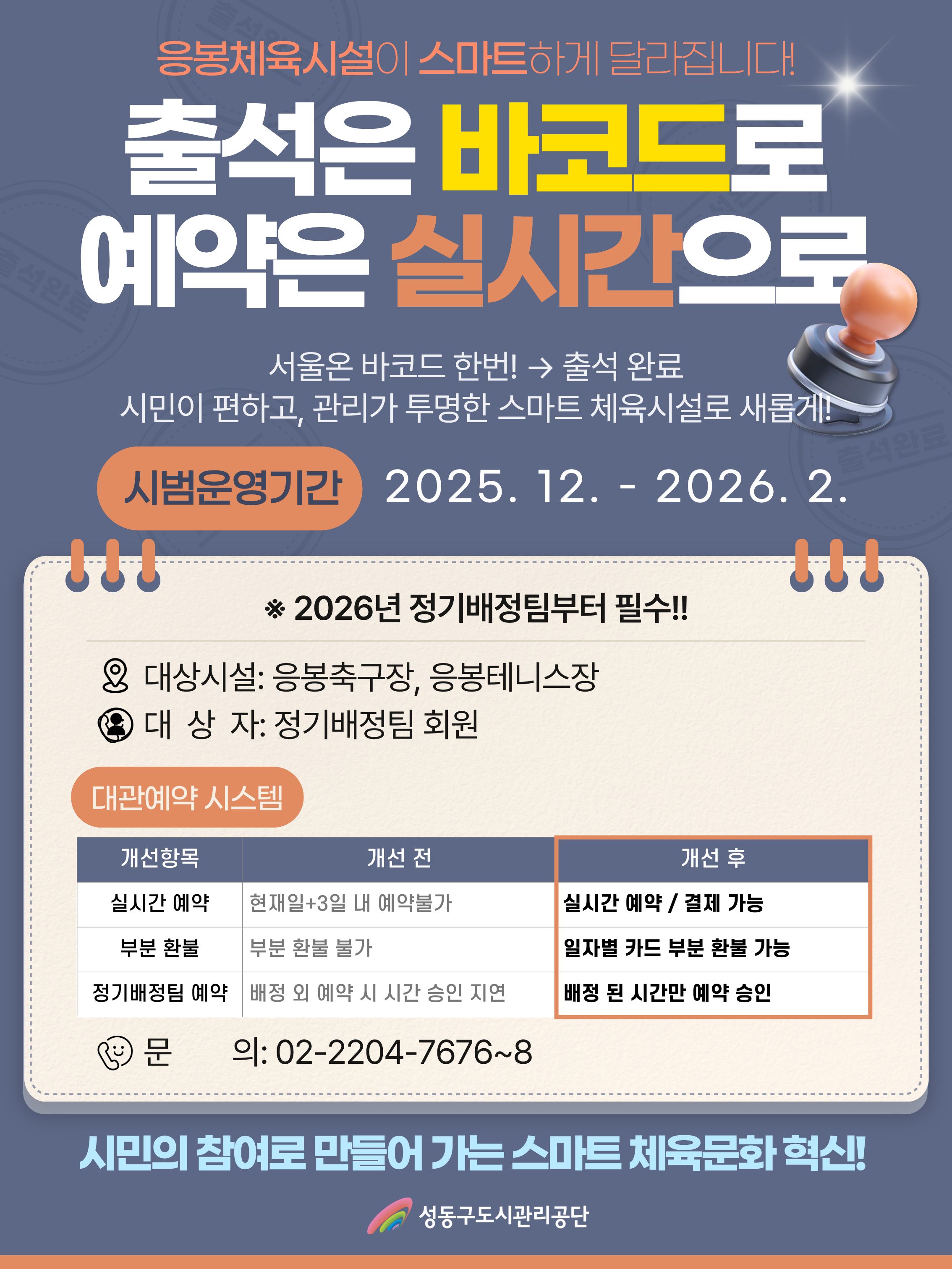 공지 응봉 야외체육시설 및 예약, 환불 시스템 업데이트 안내 작성자 관리자 등록일자 2025년 12월 8일 20시 32분 20초 조회 96 출석은 바코드로.jpg [ Size : 540.85KB , Down : 24 ] 미리보기 다운로드 출입방법.jpg [ Size : 183.62KB , Down : 66 ] 미리보기 다운로드 목록보기
