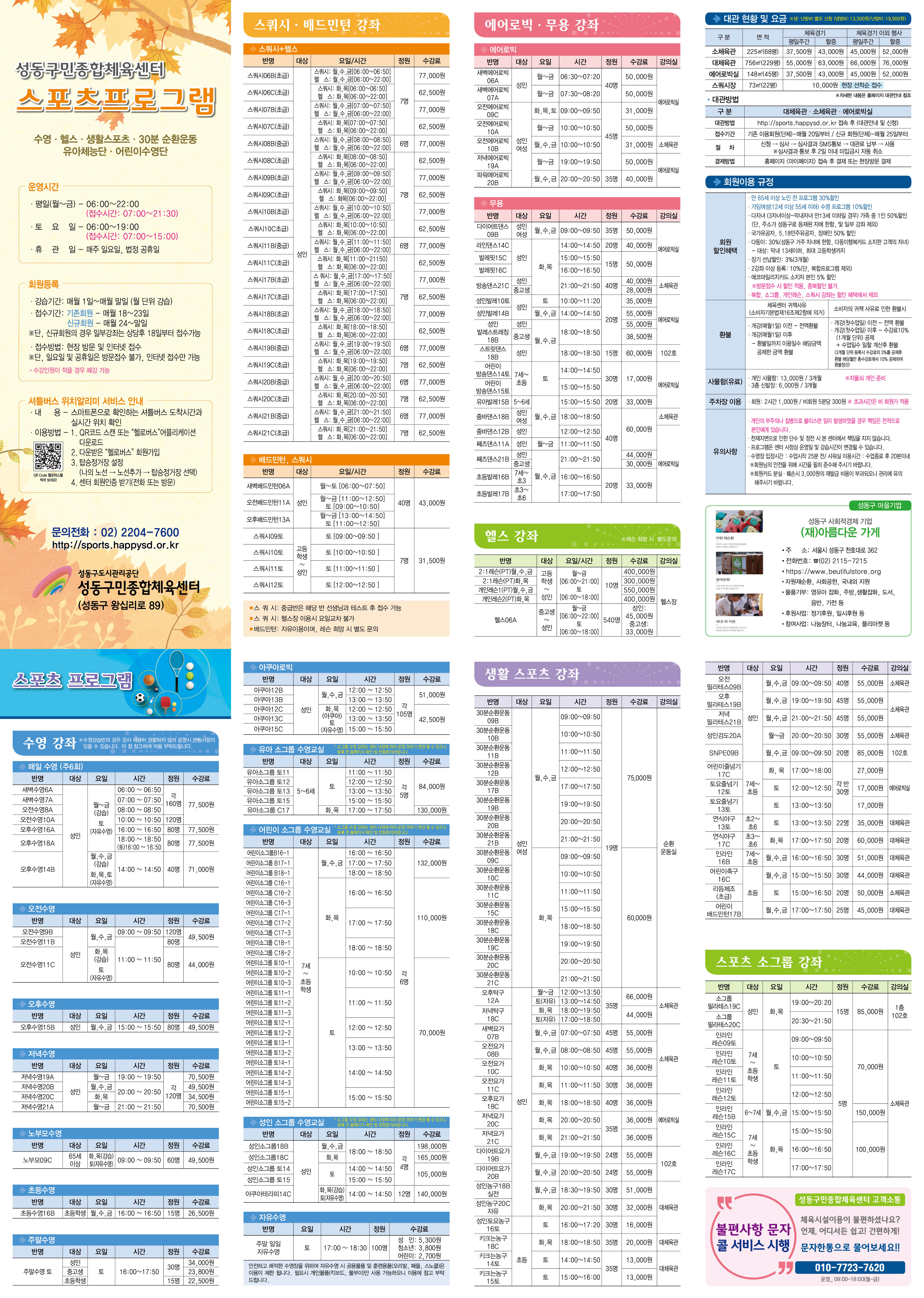 2022년 가을 스포츠,문화강좌 안내[성동구민종합체육센터] 작성자 관리자 등록일자 2022년 8월 17일 9시 10분 57초 조회 1,063 2022년 가을 성동-스포츠 강좌.jpg [ Size : 2.9MB , Down : 628 ] 미리보기 다운로드 2022년 가을 성동-문화 강좌.jpg [ Size : 2.77MB , Down : 416 ] 미리보기 다운로드 목록보기