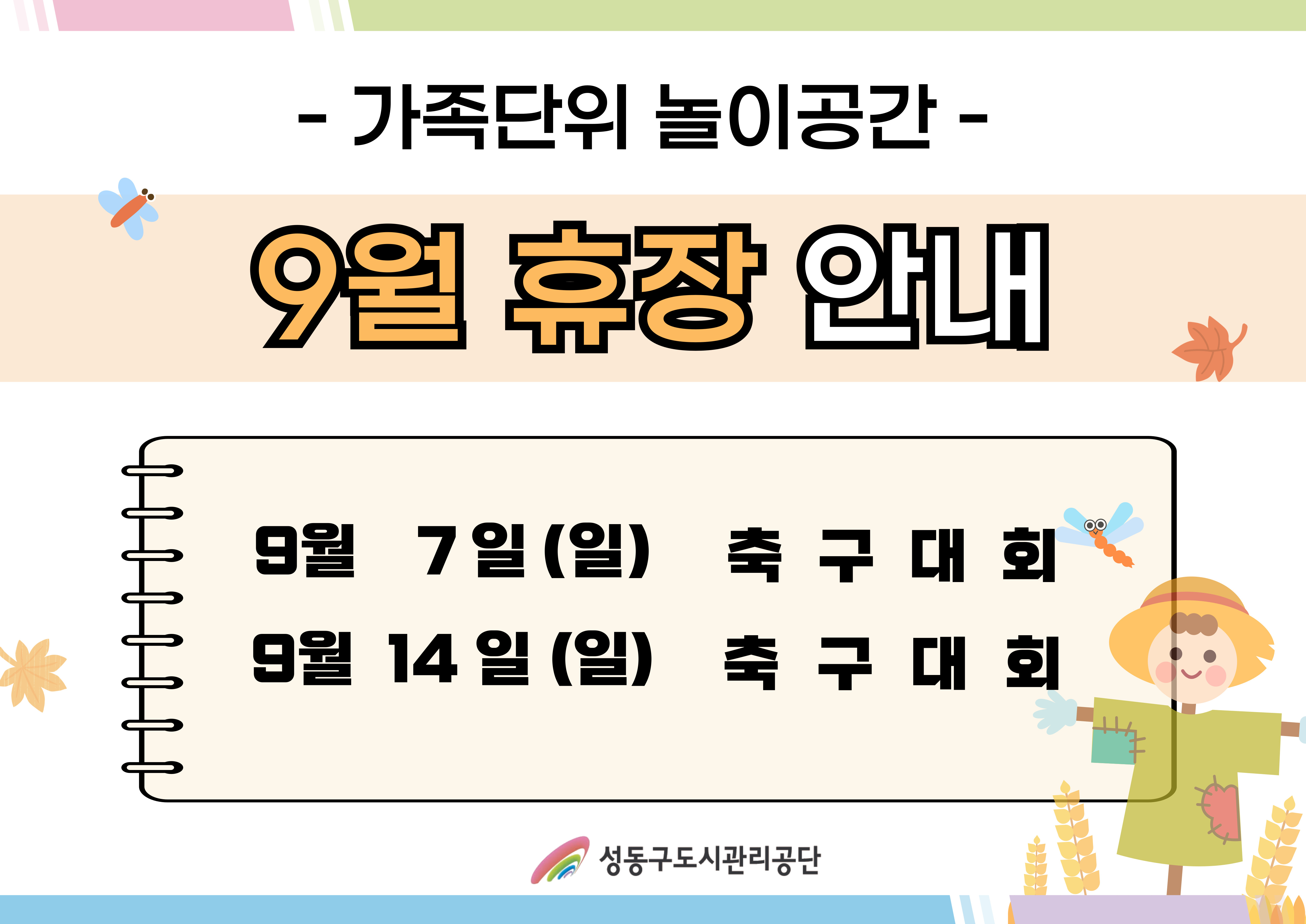 가족단위 놀이공간 9월 휴장 안내문 작성자 관리자 등록일자 2025년 9월 7일 16시 34분 4초 조회 148 9월 휴장안내.jpg [ Size : 784.34KB , Down : 101 ] 미리보기 다운로드 목록보기