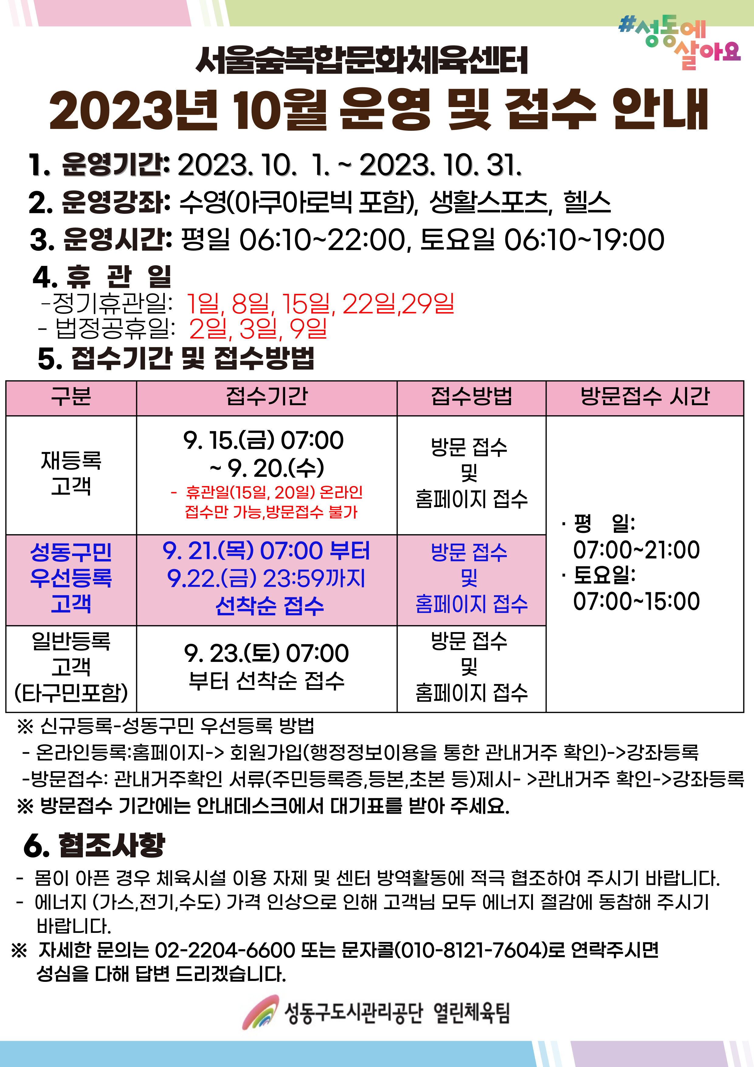 서울숲복합문화체육센터 10월 운영 및 접수안내 작성자 관리자 등록일자 2023년 9월 14일 17시 12분 43초 조회 1,095 10월 운영 및 접수안내문.jpg [ Size : 1.14MB , Down : 699 ] 미리보기 다운로드 목록보기