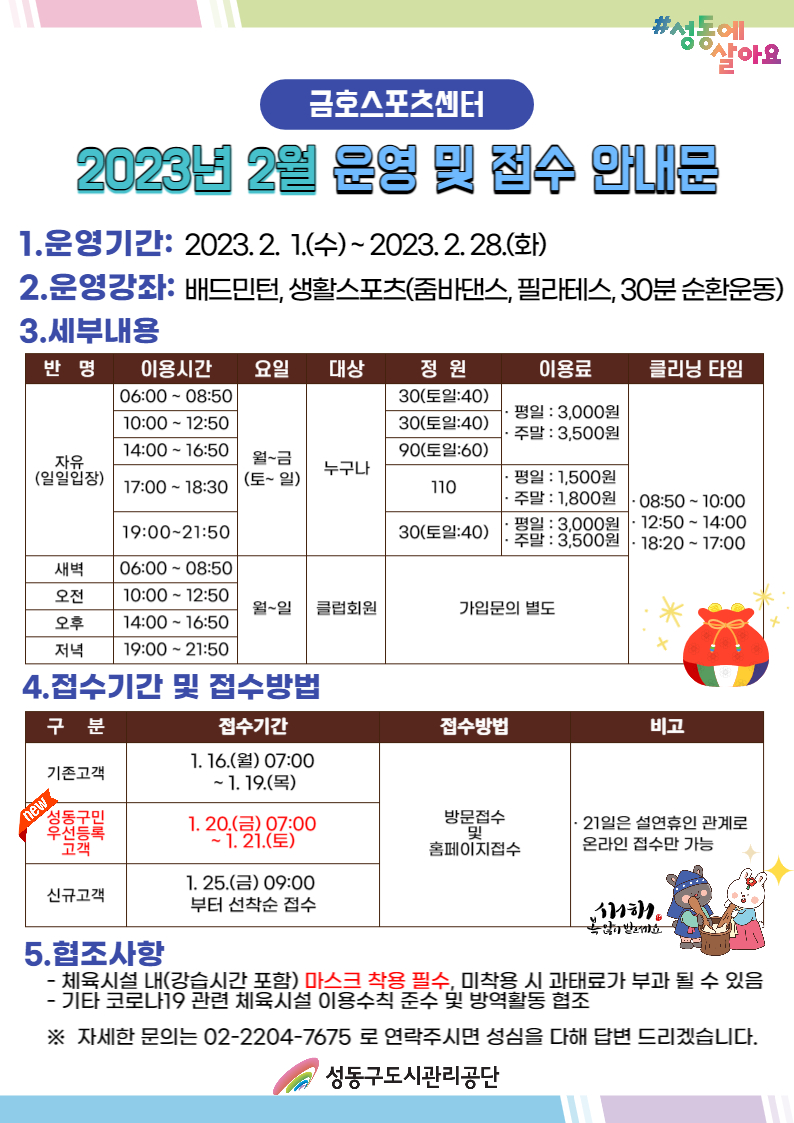 [금호스포츠센터] 2023년 2월 강좌 운영 및 접수 안내 작성자 관리자 등록일자 2023년 1월 12일 9시 35분 36초 조회 761 2023년 2월 운영 및 접수안내문(금호스포츠센터).jpg [ Size : 464.33KB , Down : 400 ] 미리보기 다운로드 목록보기